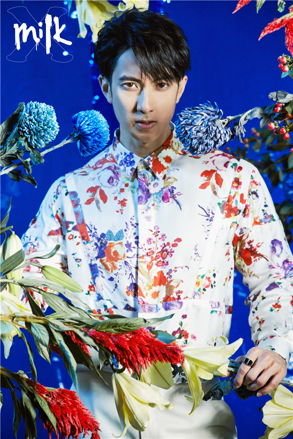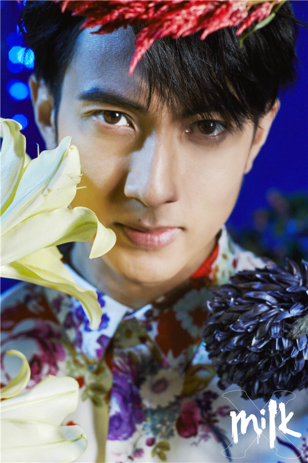 他身穿粉色西装外套搭配印花衬衫,手持花束生机满满,演绎浪漫热烈