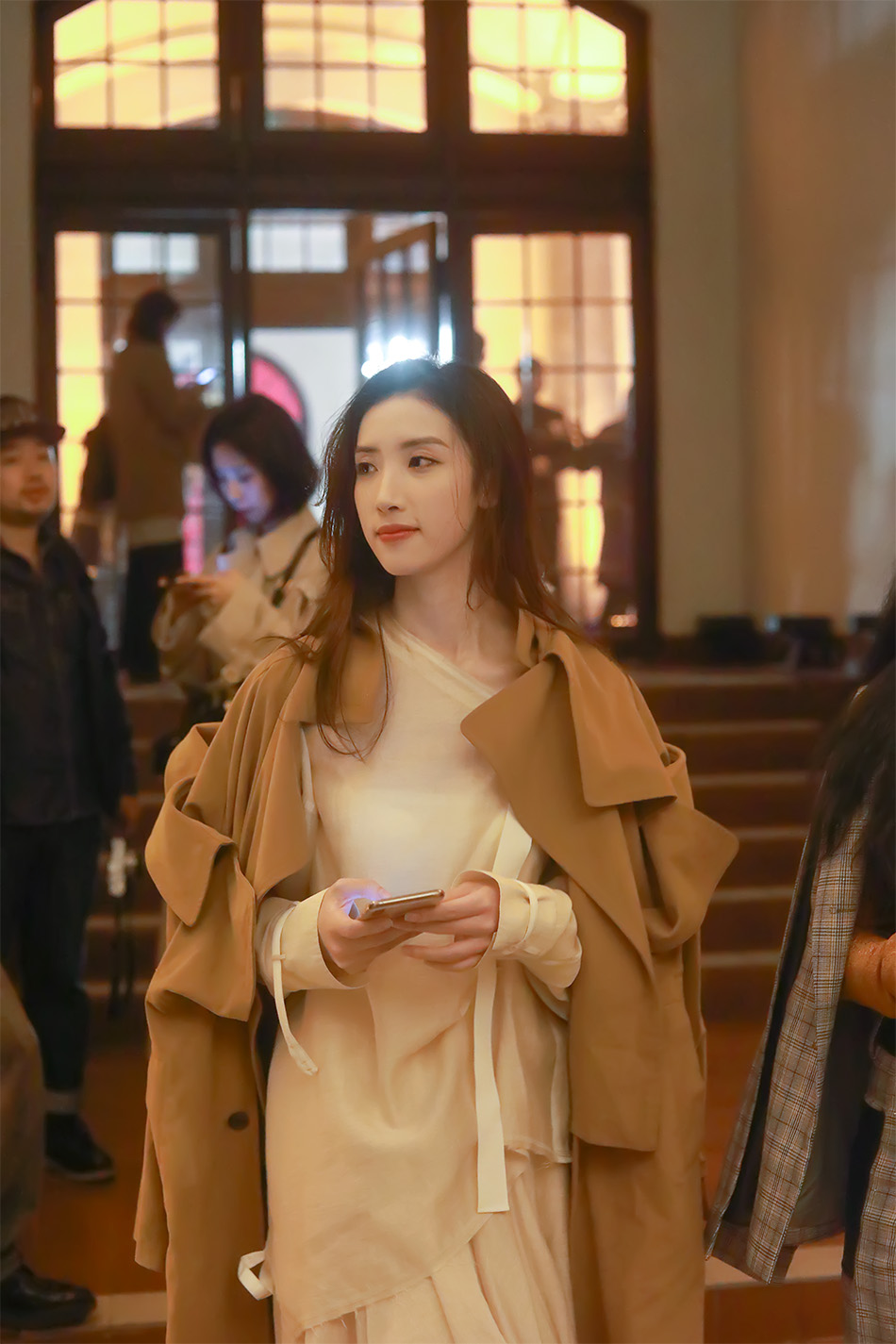 裸粉色薄纱连衣裙外搭长款风衣,灵动温婉,随性中不失设计感,极具儒雅格调,大波浪卷发造型,既清新又优美,明媚中又突显点点张力,甜美干净的妆容,精致大气。