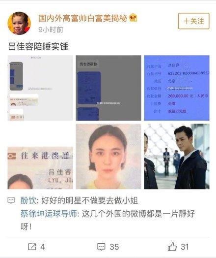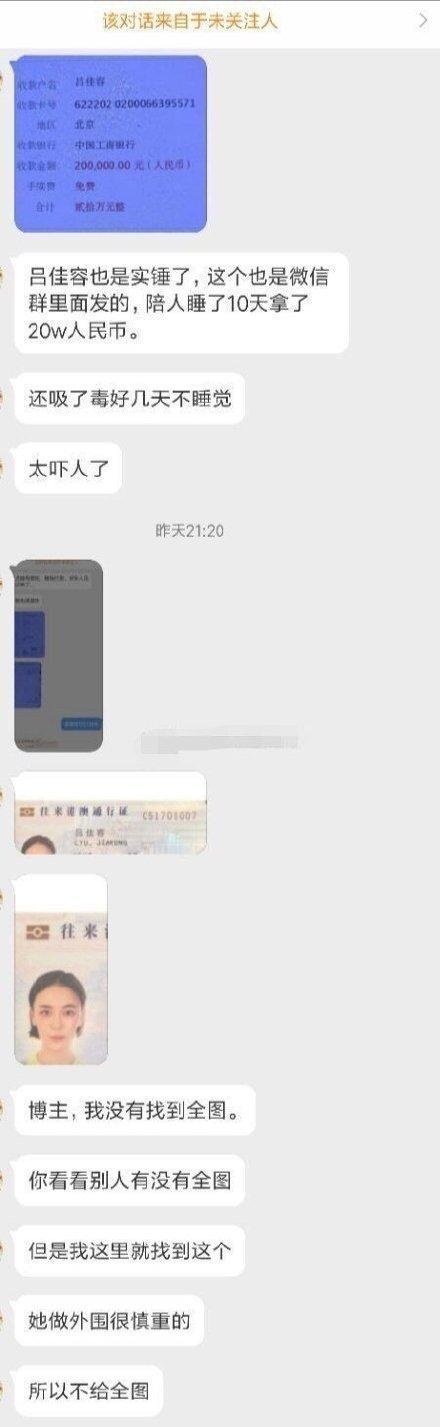 再来看看“吕佳容陪睡”到底是怎么回事?6月2日上午,网上突然有人爆出“吕佳容陪睡、吸毒”的传闻,并贴出了相关的转账记录、港澳通行证照片,一时间在网络引起轩然大波。