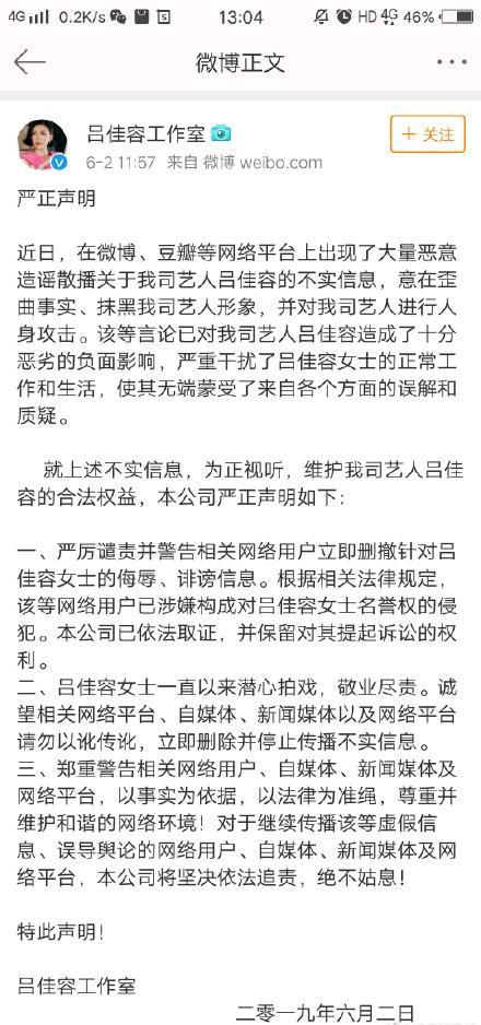 2019年6月2日,吕佳容工作室发布声明,否认了“网传吕佳容陪睡”传闻,并严厉谴责、警告相关网络用户,立即删除针对吕佳容的侮辱和不实传闻。