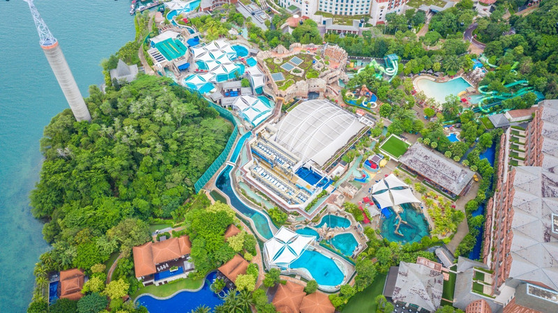 红色三角形是环球影城的出入口,蓝色三角形是S.E.A.海洋馆的出入口,那个红色的长条形甲壳状的建筑就是海洋馆。