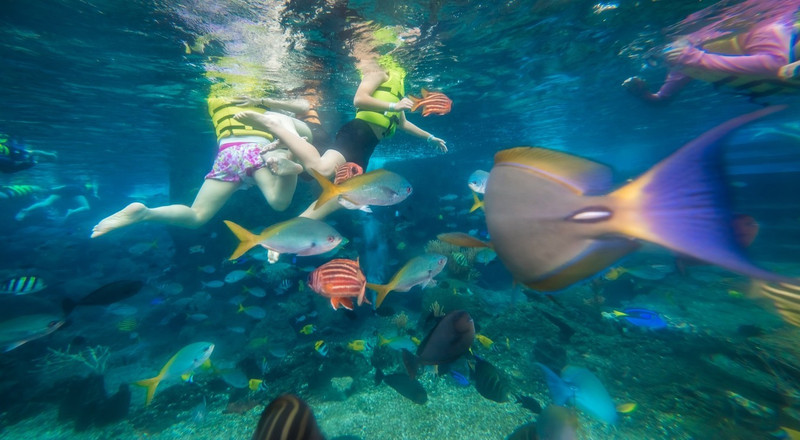 【彩虹礁游】项目是模仿近海珊瑚礁生态系统,用玻璃和海底天然的珊瑚礁围合而成的一个大型浮潜池,景区提供救生衣和呼吸面罩,即使不会游泳也可以享受被热带鱼群包围的奇妙感受。