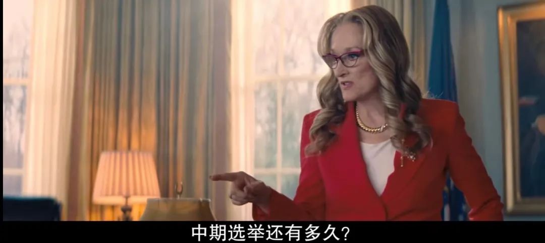 等到梅姨饰演的女总统终于姗姗来迟,进了办公室,却是一通乱打岔。