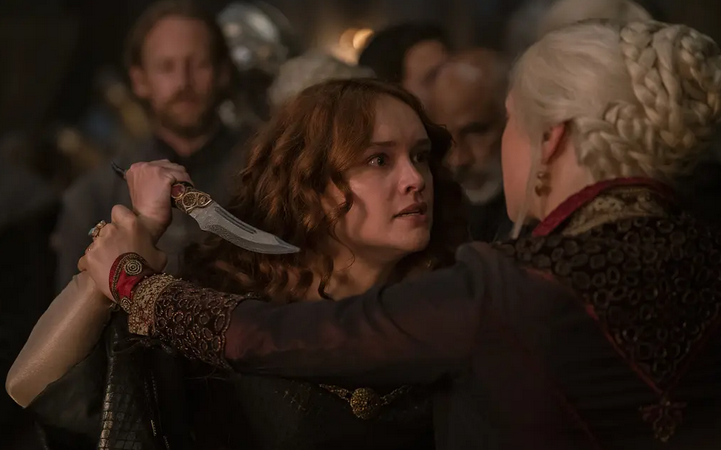 孩子们见了血,闹出大事,也让家长们之间的表面和平无法继续维系,阿莉森一边叫喊着要以眼还眼,一边用匕首划伤了雷妮拉,闺蜜终于彻底反目,哪怕韦赛里斯再怎么和稀泥,也无济于事了。