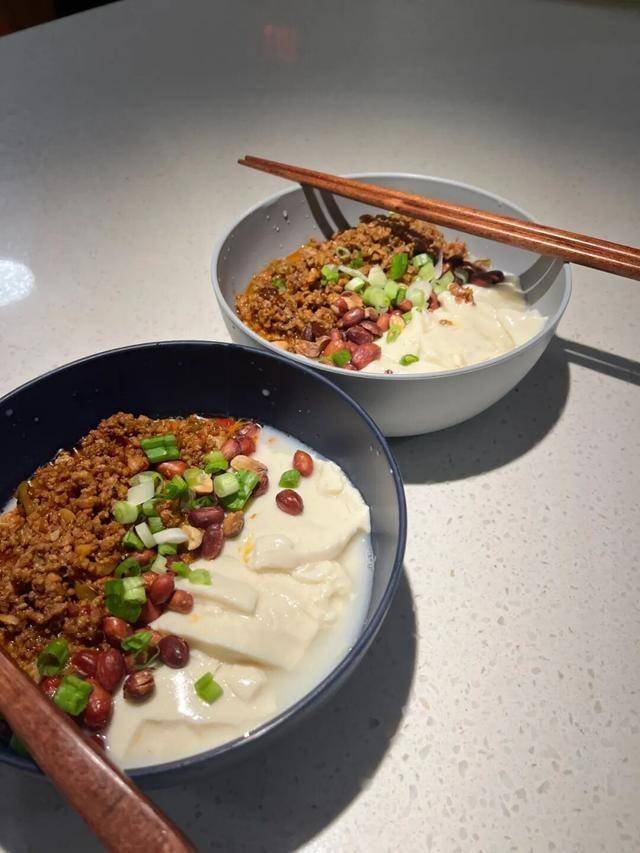 在美国大学开学第一周就把脚崴伤了,一口气长了十斤,再加上课程注册不顺、天气阴郁,整个人一下子就垮掉了。上个周末决定给自己放个假,用一早上复刻了小时候在外婆家楼下8块一碗的豆花面:豆浆做汤底,宽面条和豆腐煮熟后和汤底在一旁做素面,捞出来蘸红油辣椒哨子吃,一口气吃完唇齿留香,胃口的满足让我重新找回对生活的掌控。