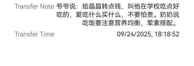9月,我成为一名大一新生(也是爷爷奶奶的校友)。9月中下旬,收到神秘私信,原来是奶奶悄悄给我转了一笔小钱,还附带了一段很可爱的备注。
