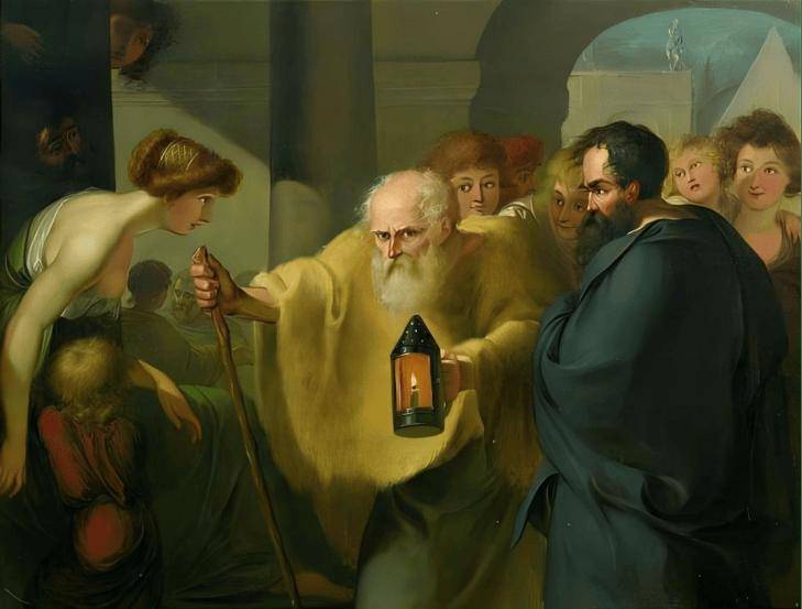 油灯是第欧根尼的标配,据说他白天也提在手上,目的是要寻找真正诚实的人,就如德国画家蒂施拜因(Goethe Tischbein,1751—1829)描绘的那样。