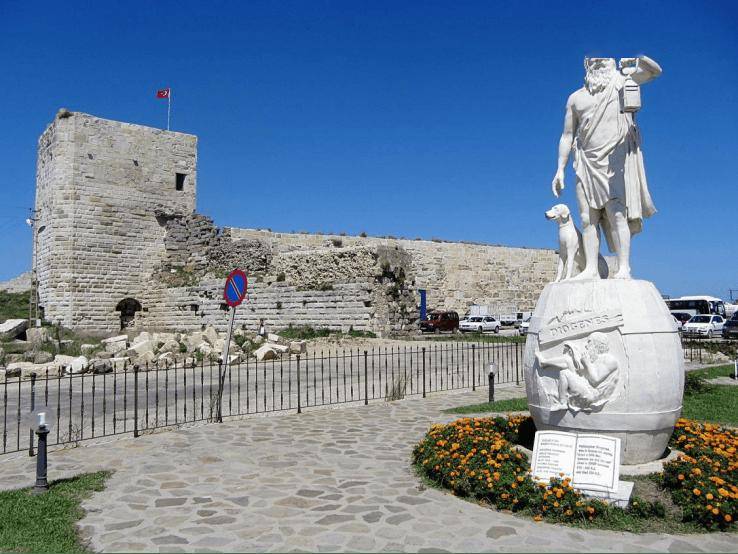 根据多种文本塑造的第欧根尼形象也很多,通常是个衣不蔽体或破衣褴褛的中老年人,除了油灯之外,有时还拄着一根棍子或跟着一只狗。图6是他家乡锡诺普建立的一座雕像,这个黑海之滨的城市如今是一个旅游圣地,第欧根尼则是它的一个重要名片。