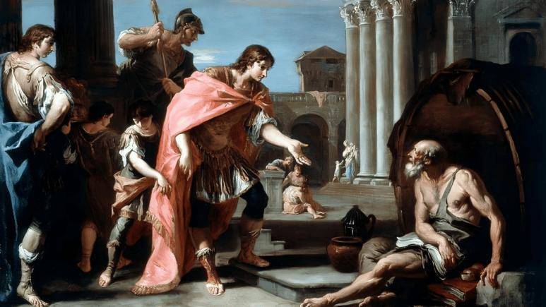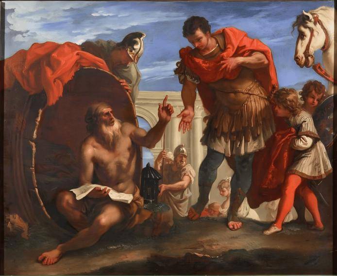 有几个关于第欧根尼与亚历山大大帝的故事广为流传,其中影响最大的一则出自罗马作家普鲁塔克(Plutarch,46-120)的《希腊罗马英豪列传》,后来成了许多艺术家创作的素材。话说亚历山大征服了希腊本土各城邦之后,在科林斯举行的地峡运动会上被推为统帅,决定向希腊世界的宿敌波斯发起战争。各城邦的政要与哲人纷纷赶来拜访与祝贺,有点像我们春秋时代的诸侯会盟,在当时是一件惊天动地的大事。出乎预料的是,近在咫尺的第欧根尼却无动于衷。普鲁塔克写道: