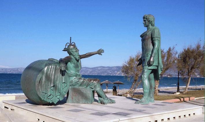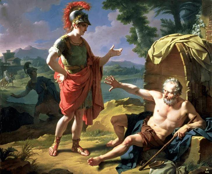 等到亚历山大前去拜访,发现他正躺着地上晒太阳。第欧根尼发现很多人走到身旁,稍微抬抬身子,用一种降尊纡贵的神色望着亚历山大,等到亚历山大很客气问他有什么地方可以效劳的时候,他说道:“很好,请你站开一点,不要挡住阳光。”有如赤子之心的回答使得亚历山大深深受到感动,这个对他不理不睬的人竟然具备视富贵如浮云的伟大气质,让他极为惊奇。他们离开之际,随行的人嘲笑哲学家的说话竟然一点都不懂人情世故,他却告诉他们,如果他不是亚历山大的话,也愿意做一个像第欧根尼那样的人物。