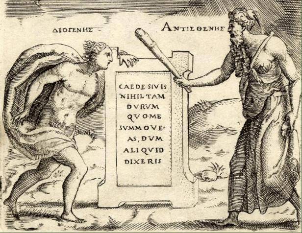 犬儒学派最有影响的人物是被拉斐尔画入《雅典学园》的第欧根尼,他生于黑海南岸的希腊殖民城市锡诺普(Sinope,今属土耳其),因参与了父亲造币引起的风波而被逐出城邦,长期活跃于希腊本土的雅典与科林斯。其真实生平很难说清,但是古代文献中留有大量关于他的传闻轶事。据说他在雅典被安提斯泰尼的苦修学说深深吸引,上门请求指导,后者不予理睬并用棍子驱赶他。第欧根尼忍着击打,最终成了安提斯泰尼的门生。图3是16世纪意大利雕刻家与版画家博纳索内(Giulio Bonasone,1531—after 1576)的一幅书籍插图,描绘了安提斯泰尼以奇特方式收徒的场景。画面中石碑上的拉丁文写着:“你想打死我就来吧。只要你说一句话,就能把我带走,这不是什么难事(Caede si vis. Nihil tam durum quo me summoveas, dum aliquid dixeris)。”