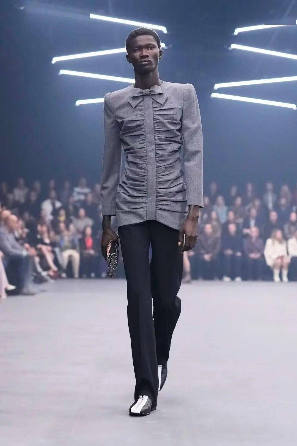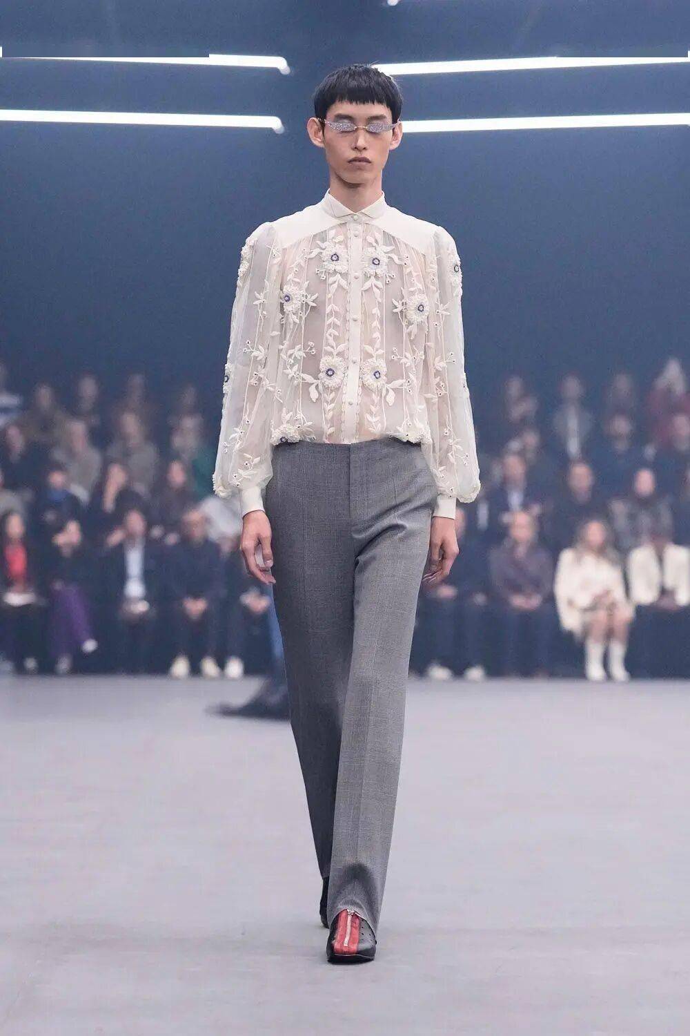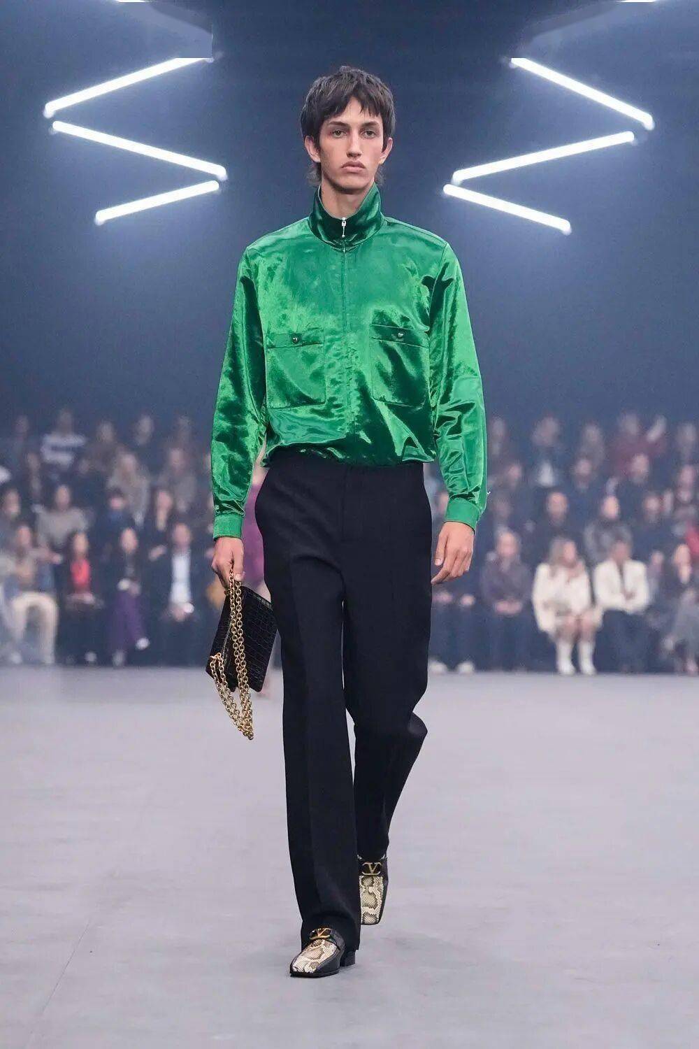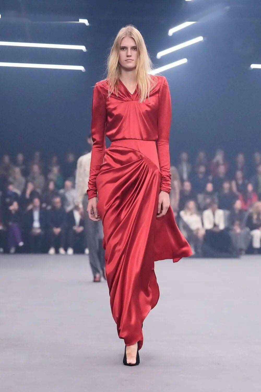 大量的丝绸与光泽感缎面,被用于制作垂坠感极强的礼服与衬衫。当模特行走时,光线在面料上流淌,形成柔和的光晕。