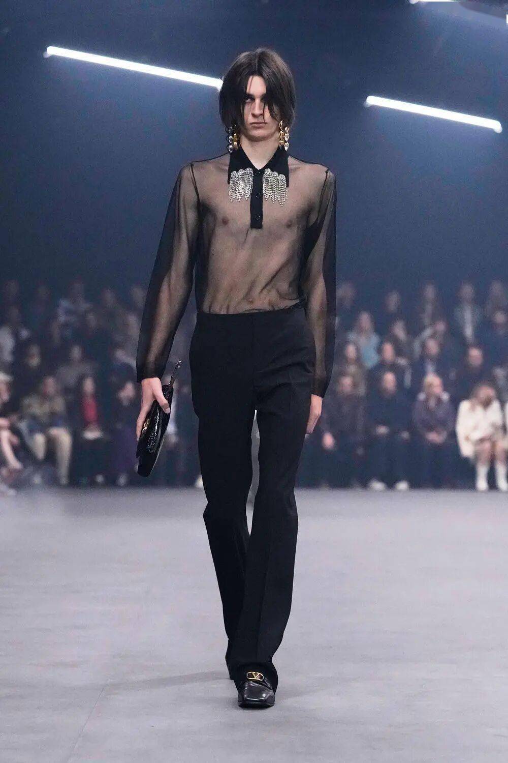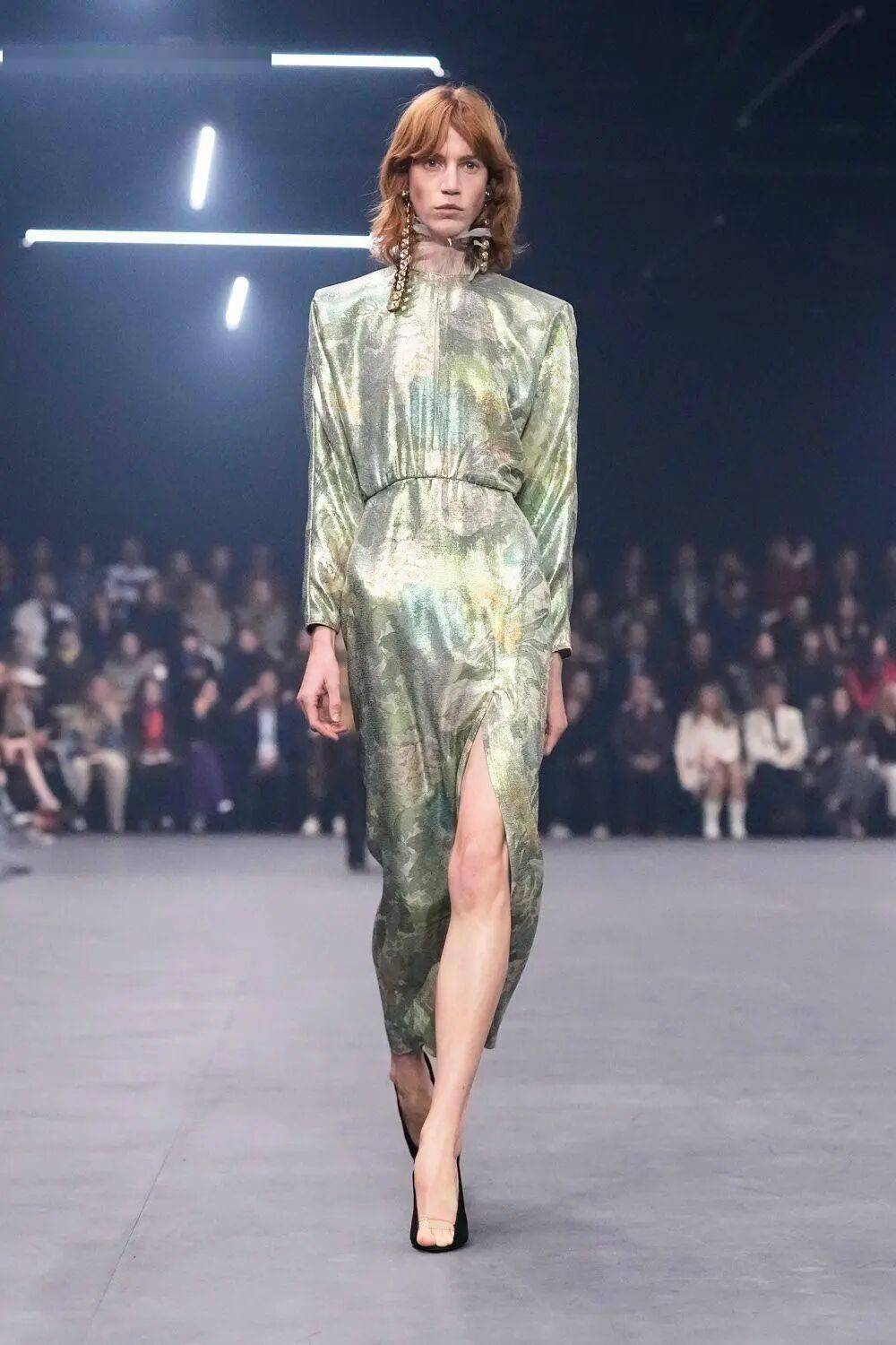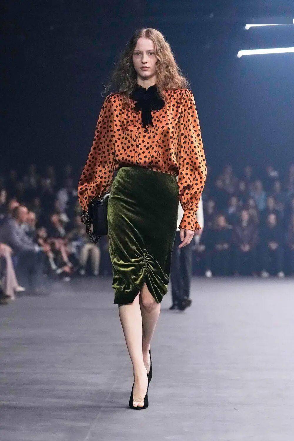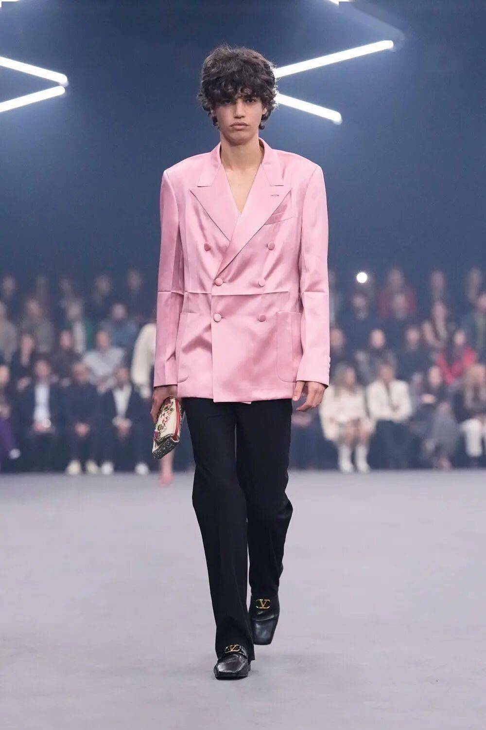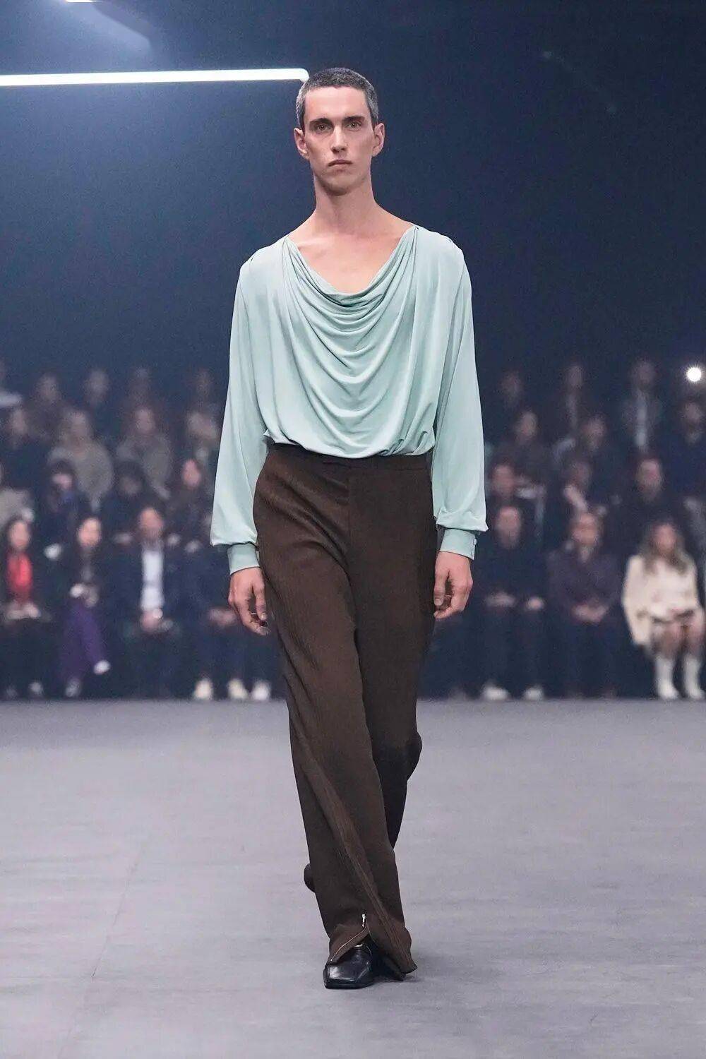 大量的丝绸与光泽感缎面,被用于制作垂坠感极强的礼服与衬衫。当模特行走时,光线在面料上流淌,形成柔和的光晕。