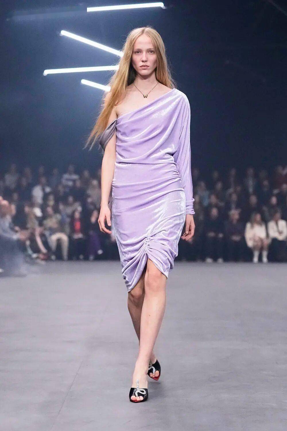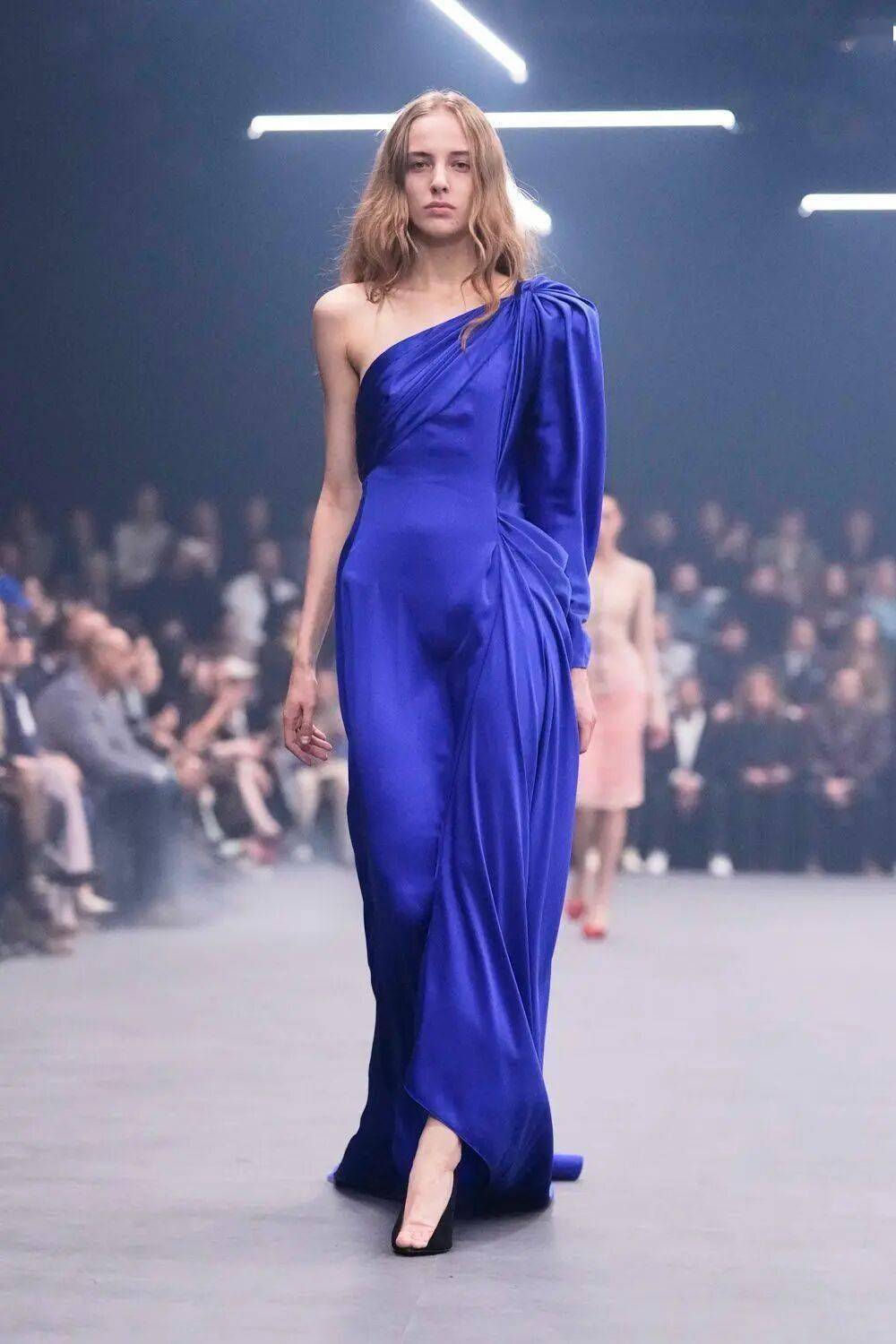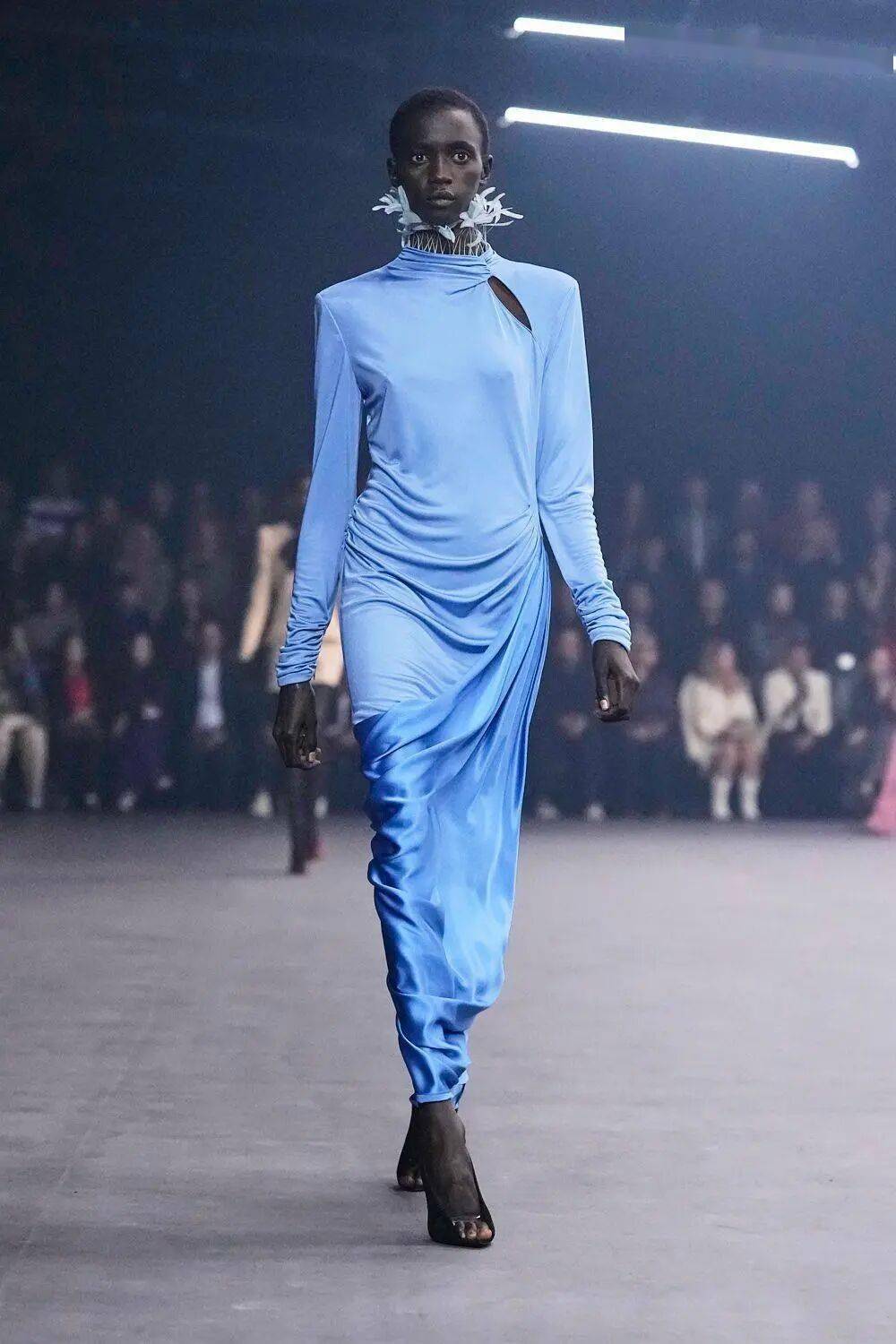 其中一件闪亮的灰色紧身衣,搭配一件轻薄的淡蓝色披肩的造型,无疑是对品牌黄金时代极致魅力的一种现代回响。