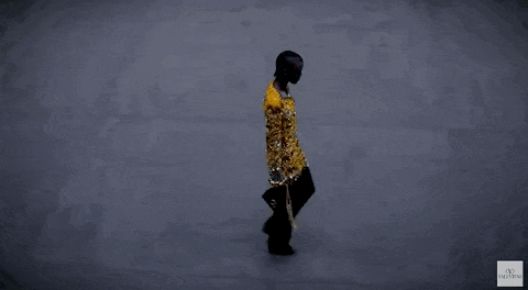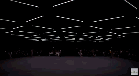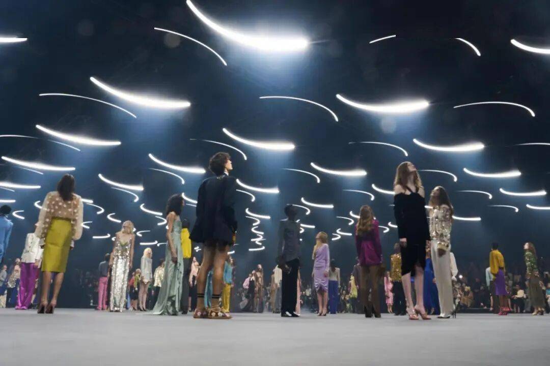 在 Valentino 的秀场中,缓慢转动的横杆与模特的行走节奏呼应,配合服装上反光的亮片和水晶,形成真正的“萤火群”。