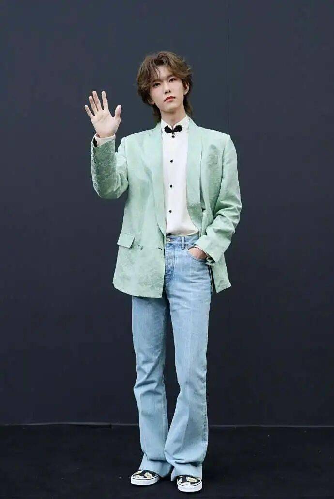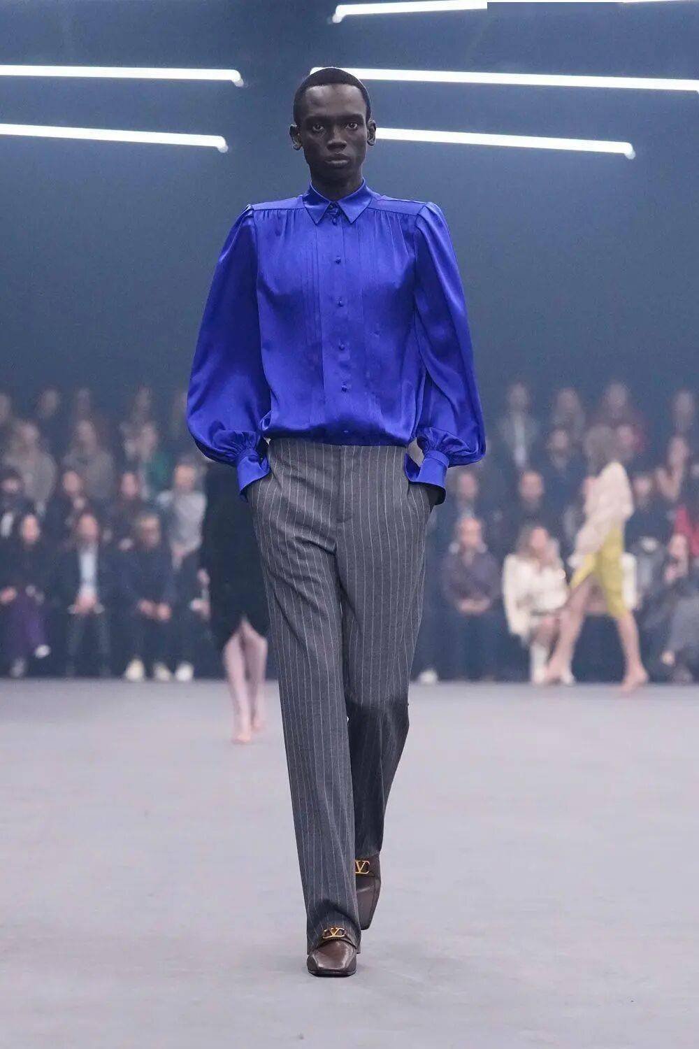 天蓝色长袖上衣,肩部高耸,但胸前与腰腹却被处理成细腻的抓褶,搭配亮黄色的丝缎长裤,力量感被诗意所中和。
