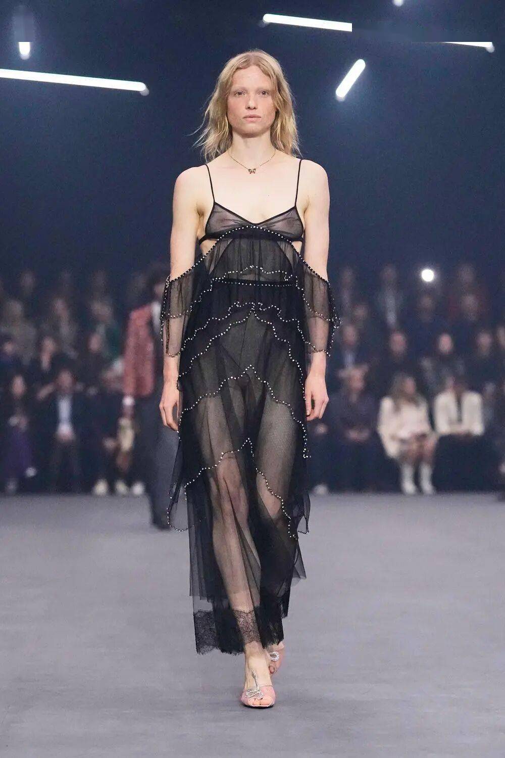 黑色薄纱连衣裙,层层叠叠的裙摆边缘缀满细小的水晶,当模特走过,水晶如光尘,忽明忽暗。