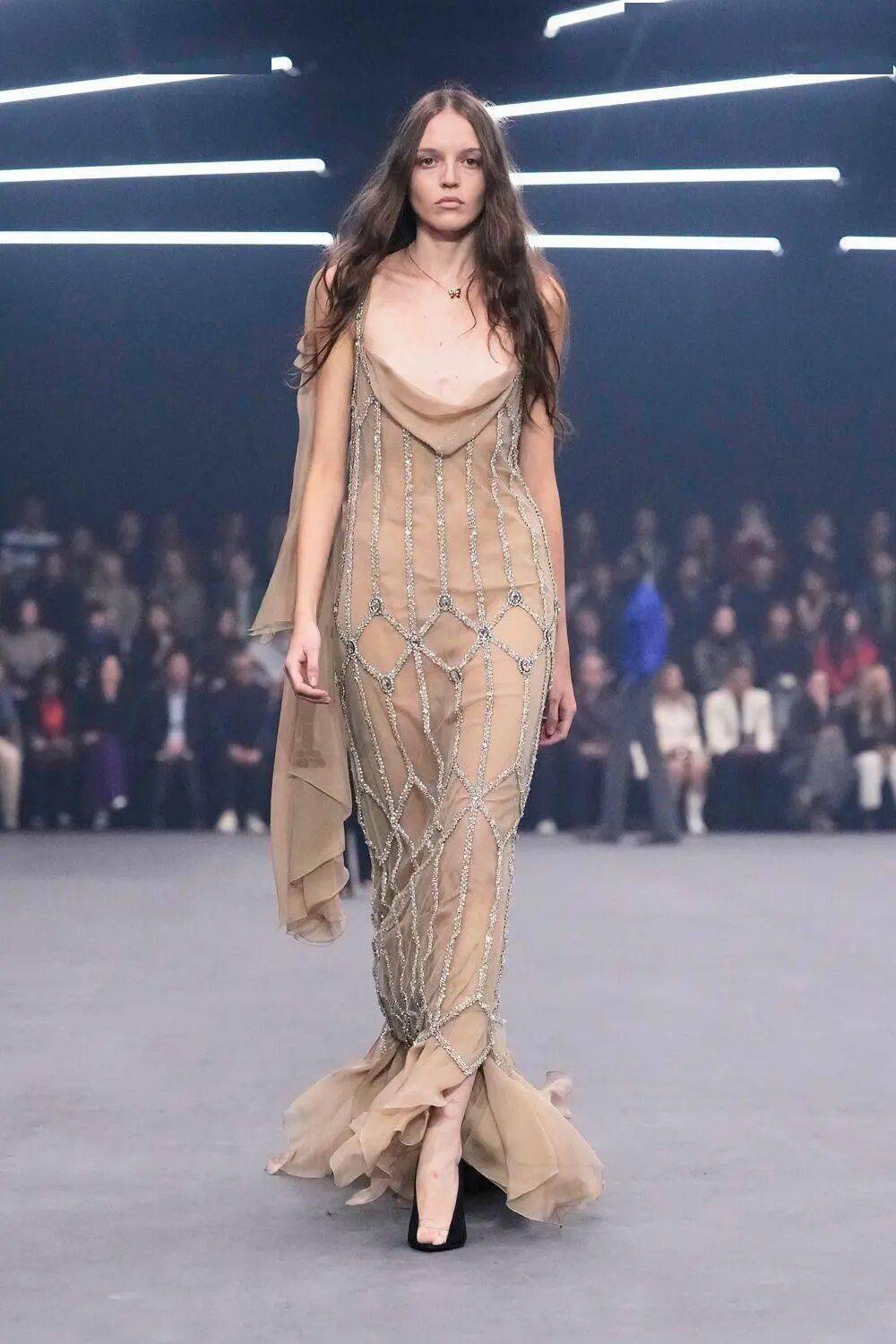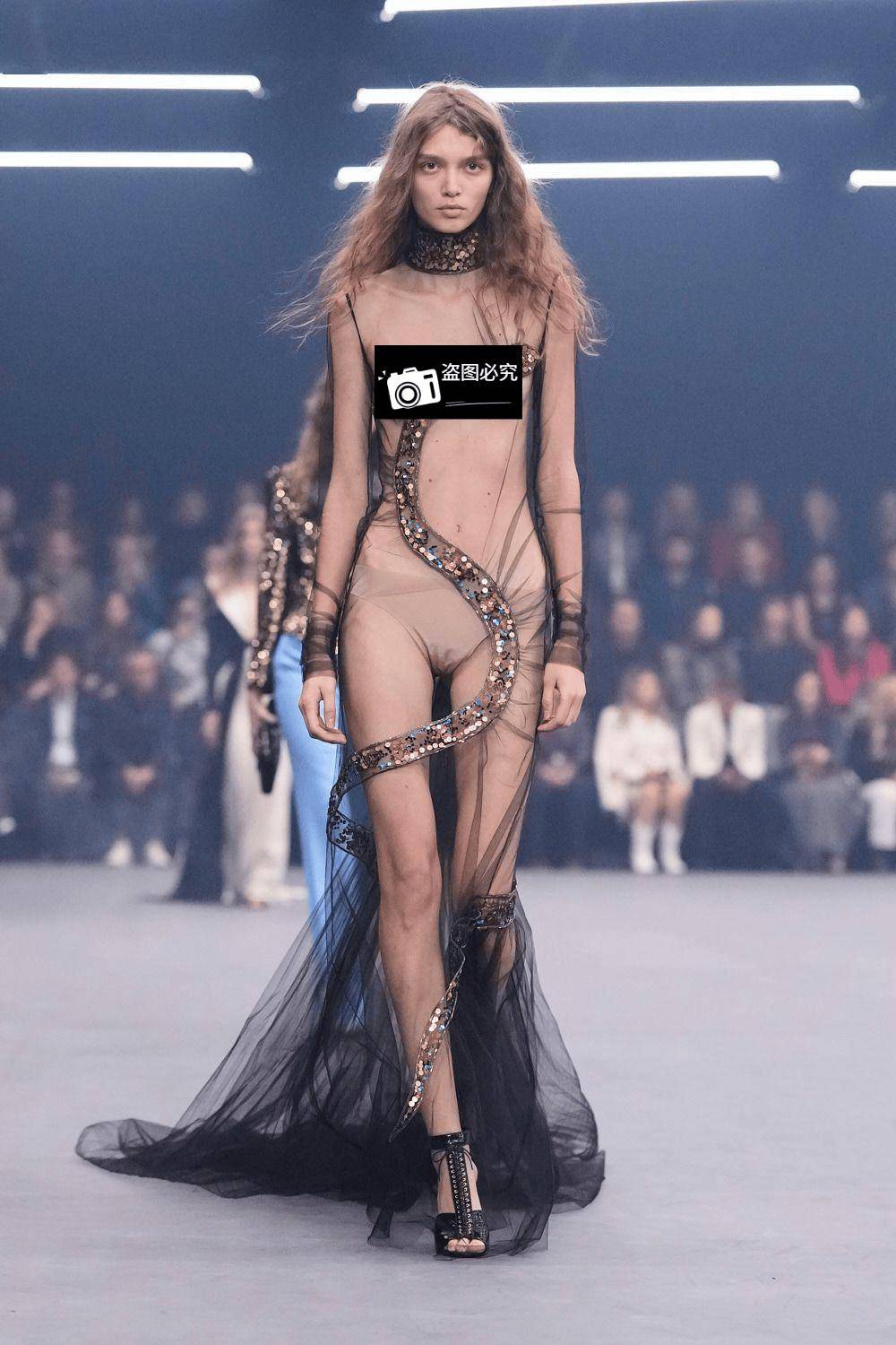 另一件近乎全裸的透视礼服,运用金线与亮片勾勒出蛇形图案,光芒仿佛是缠绕在身体上的图腾。
