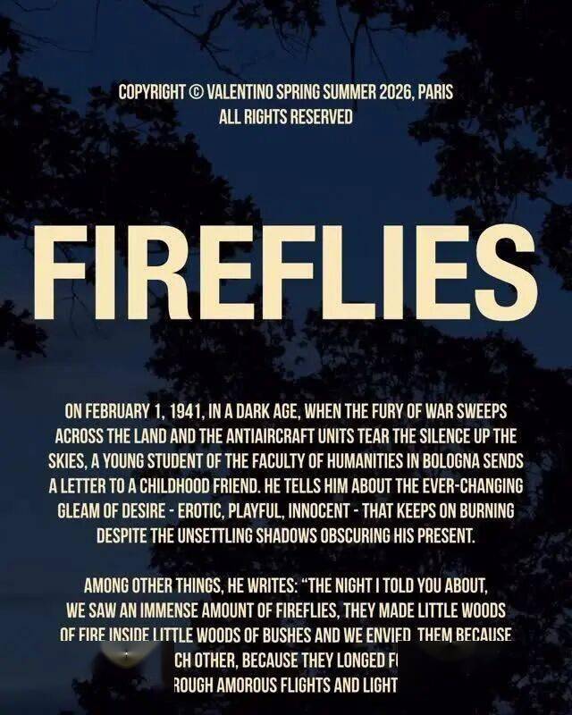“萤火”可能象征广告中“静谧场景下的微小光亮”,呼应Valentino对“层叠表象中呈现深度”的追求。品牌通过这类意象将时尚从“私人庇护所”升华为“共享的舞台”,使亲密关系在静谧氛围中展现流动的可能性