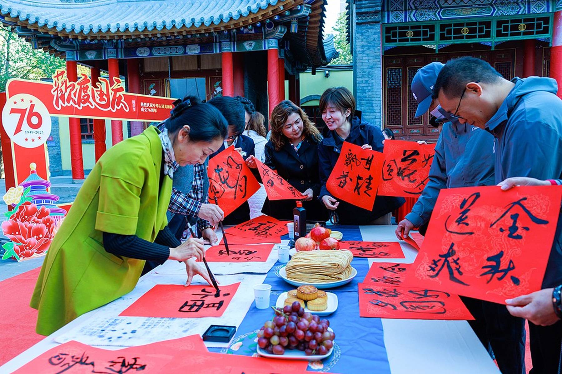 2025年10月5日,新疆乌鲁木齐,书法老师向市民赠送中秋福字和书法作品。