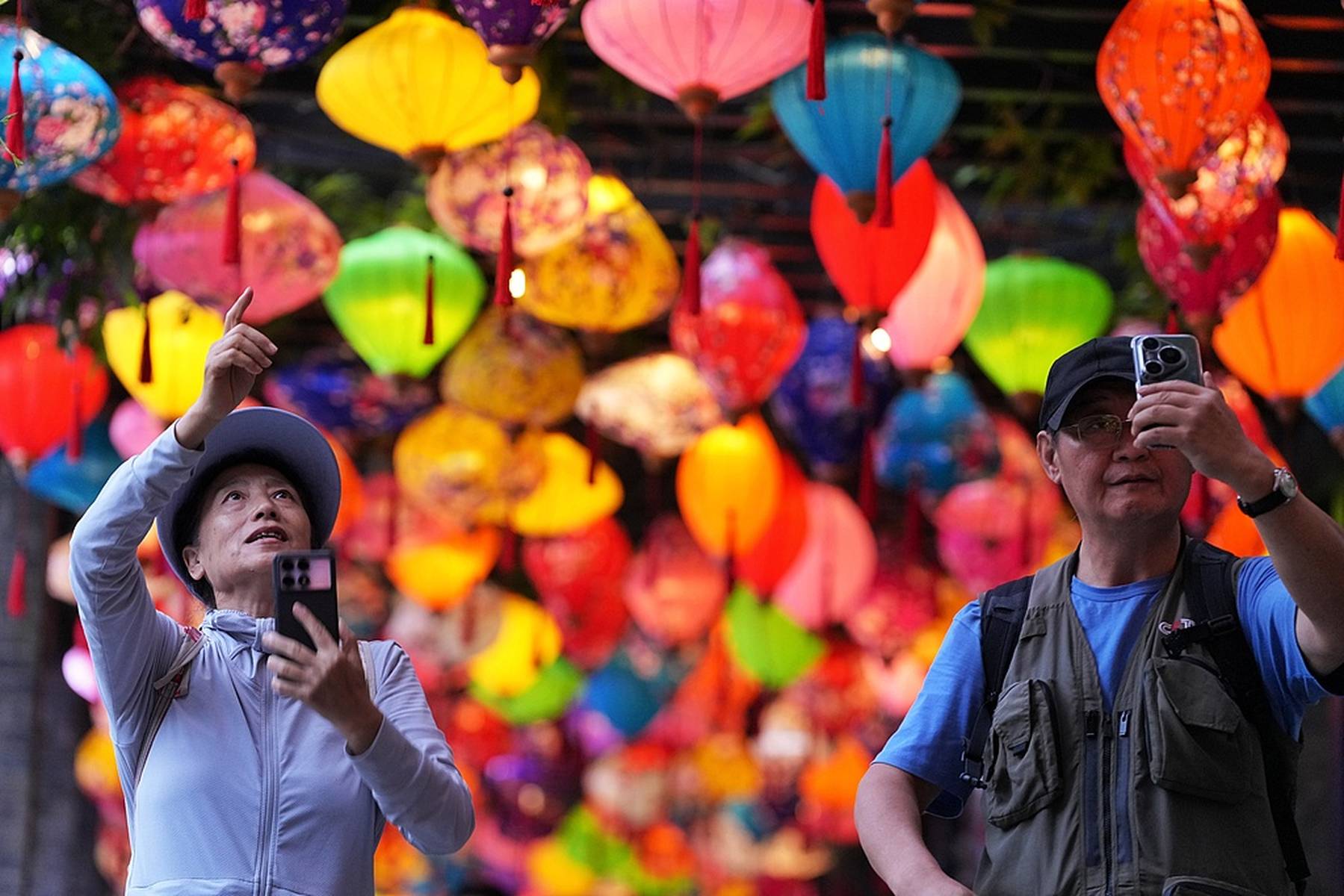 2025年10月1日,广州越秀区西门口光孝路,成排的非遗手工鱼灯笼与各式手工灯笼悬挂在店铺廊檐,洋溢着浓浓中秋氛围。图为光孝路一家鱼灯销售店面悬挂正在售卖的成排鱼灯,吸引游客选购。