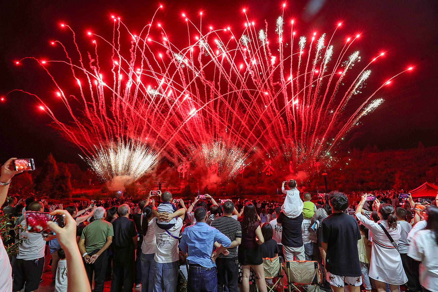 2025年10月3日晚,贵州省铜仁市,玉屏侗族自治县茶花泉景区,游客在观看燃放烟花。