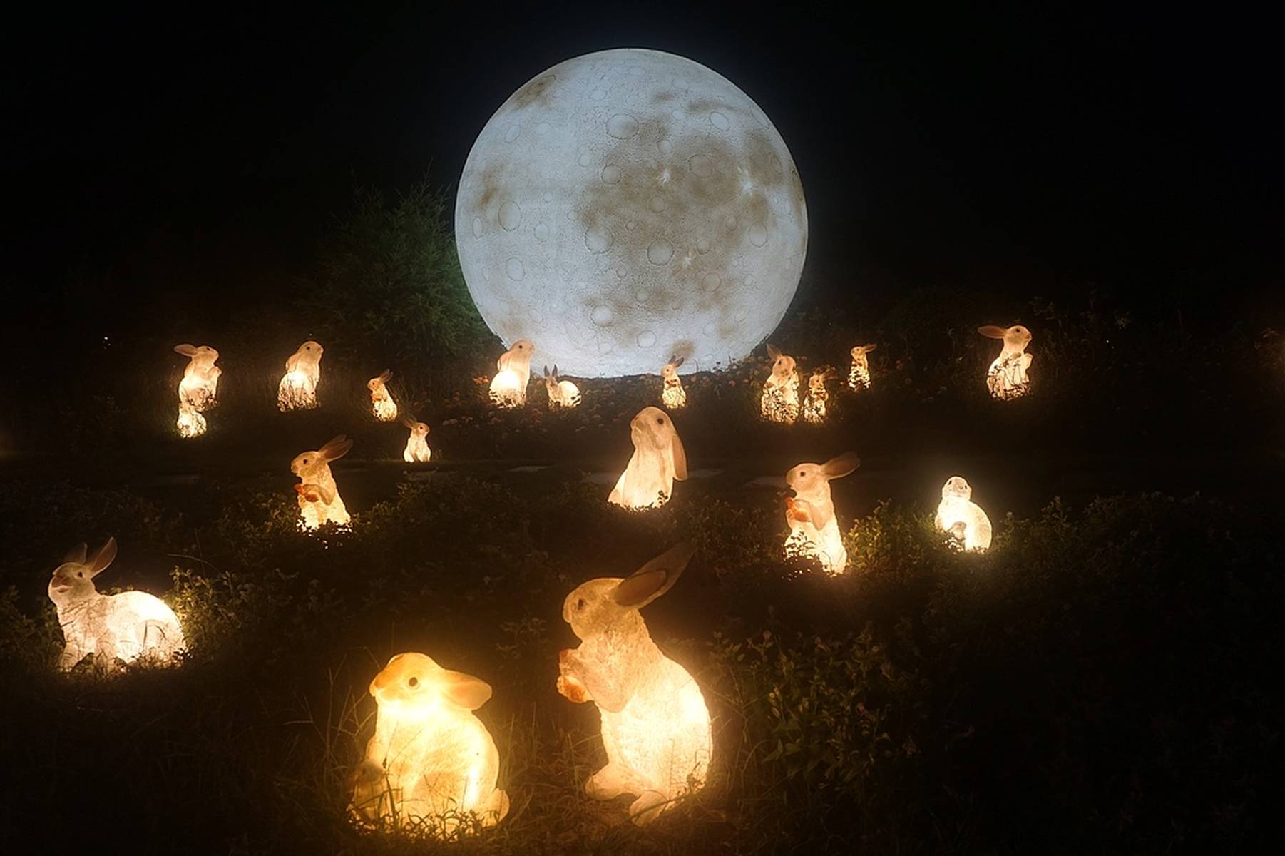 2025年10月5日晚,浙江杭州,游客在吴山广场观赏中秋主题艺术装置“玉兔伴月”。