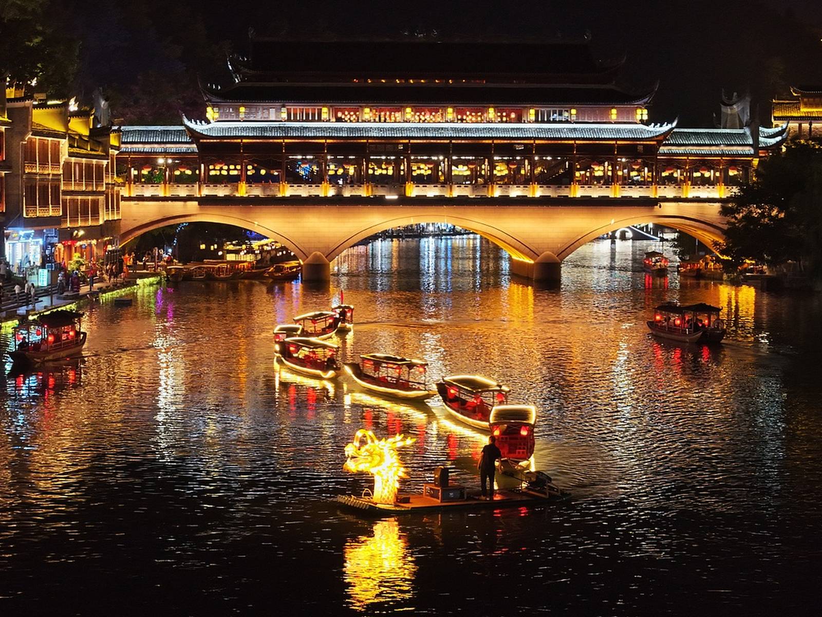2025年10月5日晚,中秋节将至,湖南凤凰古城沱江上,百米灯光金龙游船拼接出圆月图案。金龙游船首尾相接,与两岸吊脚楼灯火相映,吸引游客沉浸式感受古城中秋氛围。图为船员驾驶金龙游船在河中行驶。(无人机照片) 中新社记者 杨华峰 摄