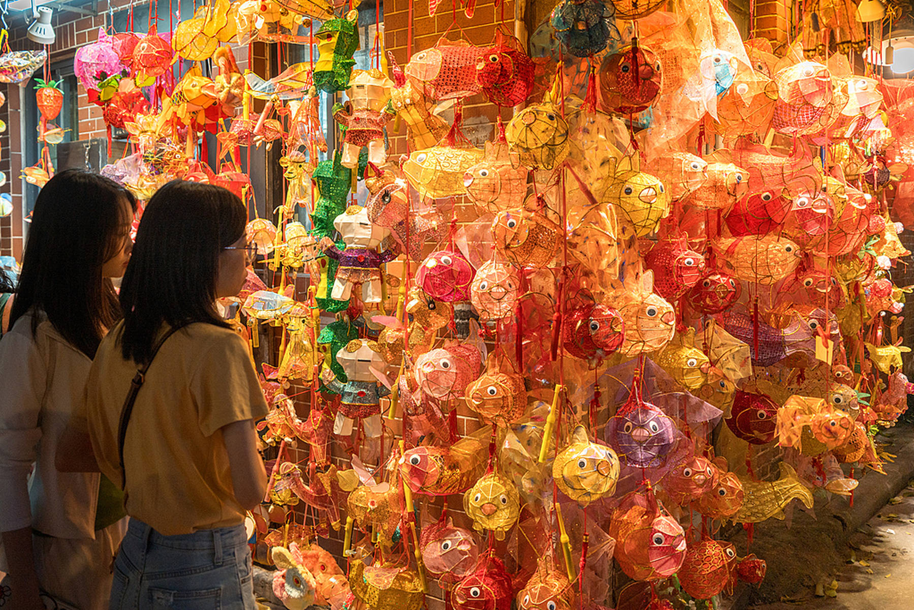 2025年10月5日,游客在江苏苏州平江路选购传统兔子灯。中秋节将至,江苏省苏州市平江路民间艺人手工制作的传统兔子灯上市后,吸引不少游客前来选购。