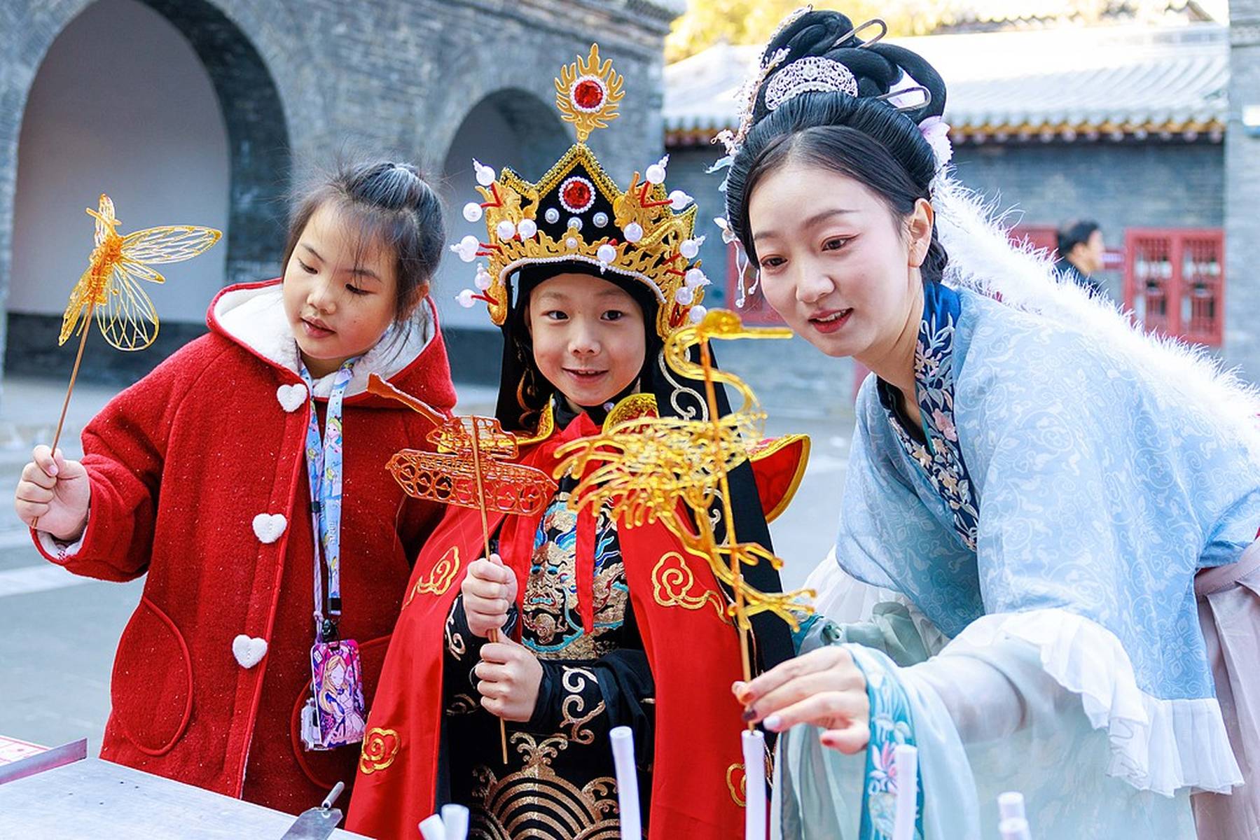 2025年10月5日,新疆乌鲁木齐,市民和孩子在文庙选购糖画。