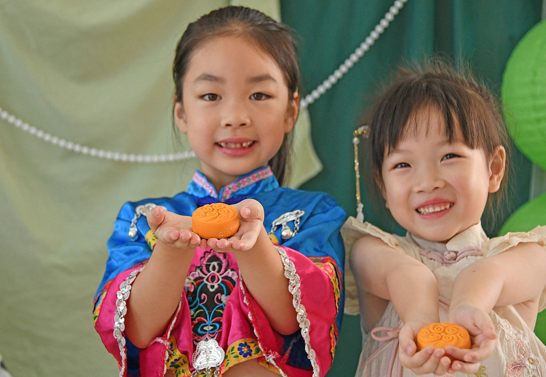 2025年10月5日,浙江省台州市仙居县迎晖幼儿园的小朋友展示制作的月饼。