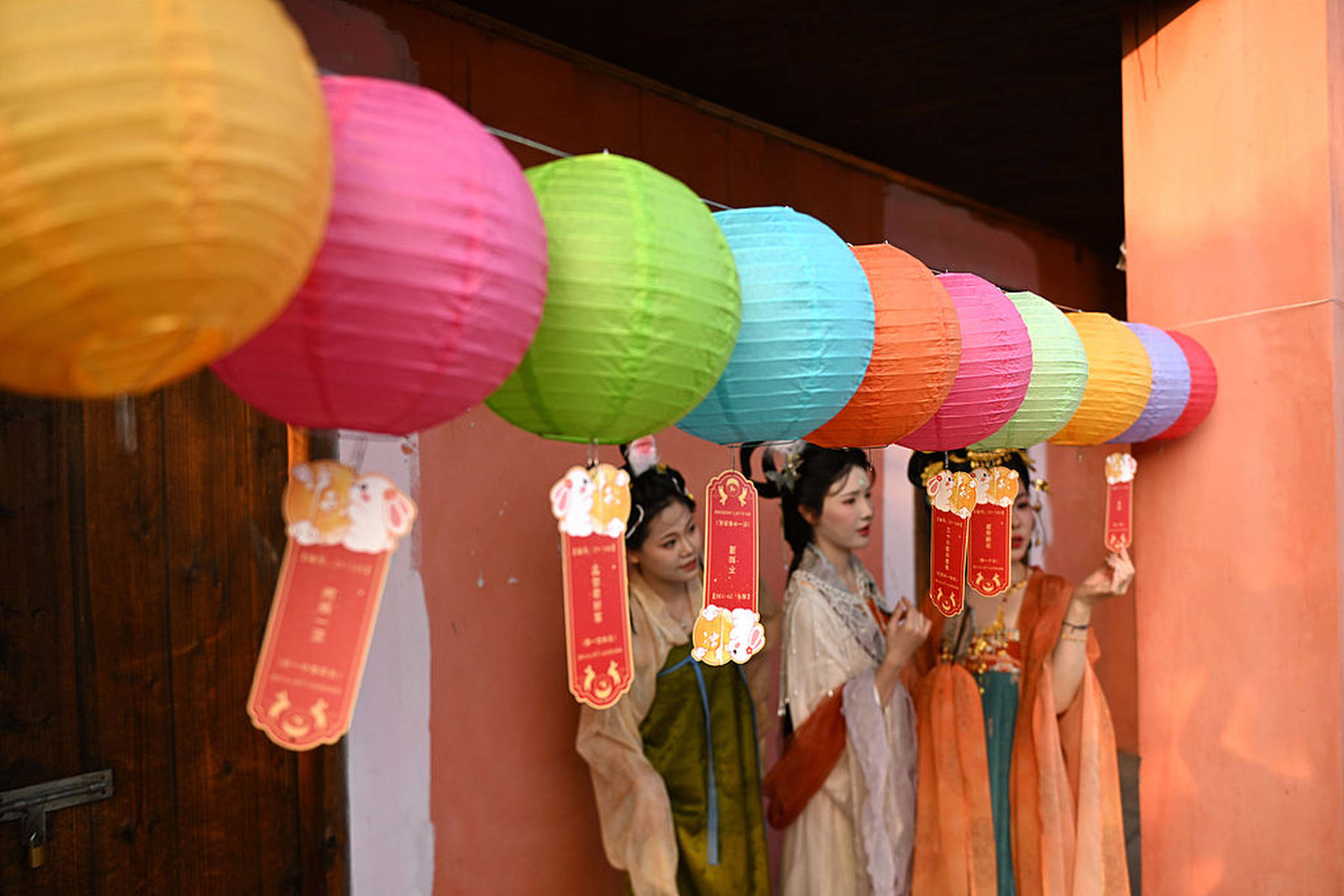 2025年10月5日,“花好月圆夜 共享邻里情”中秋民俗活动在福建省福州市仓山区梁厝特色历史文化街区举办。图为身穿汉服的女子猜灯谜。 中新社记者 吕明 摄