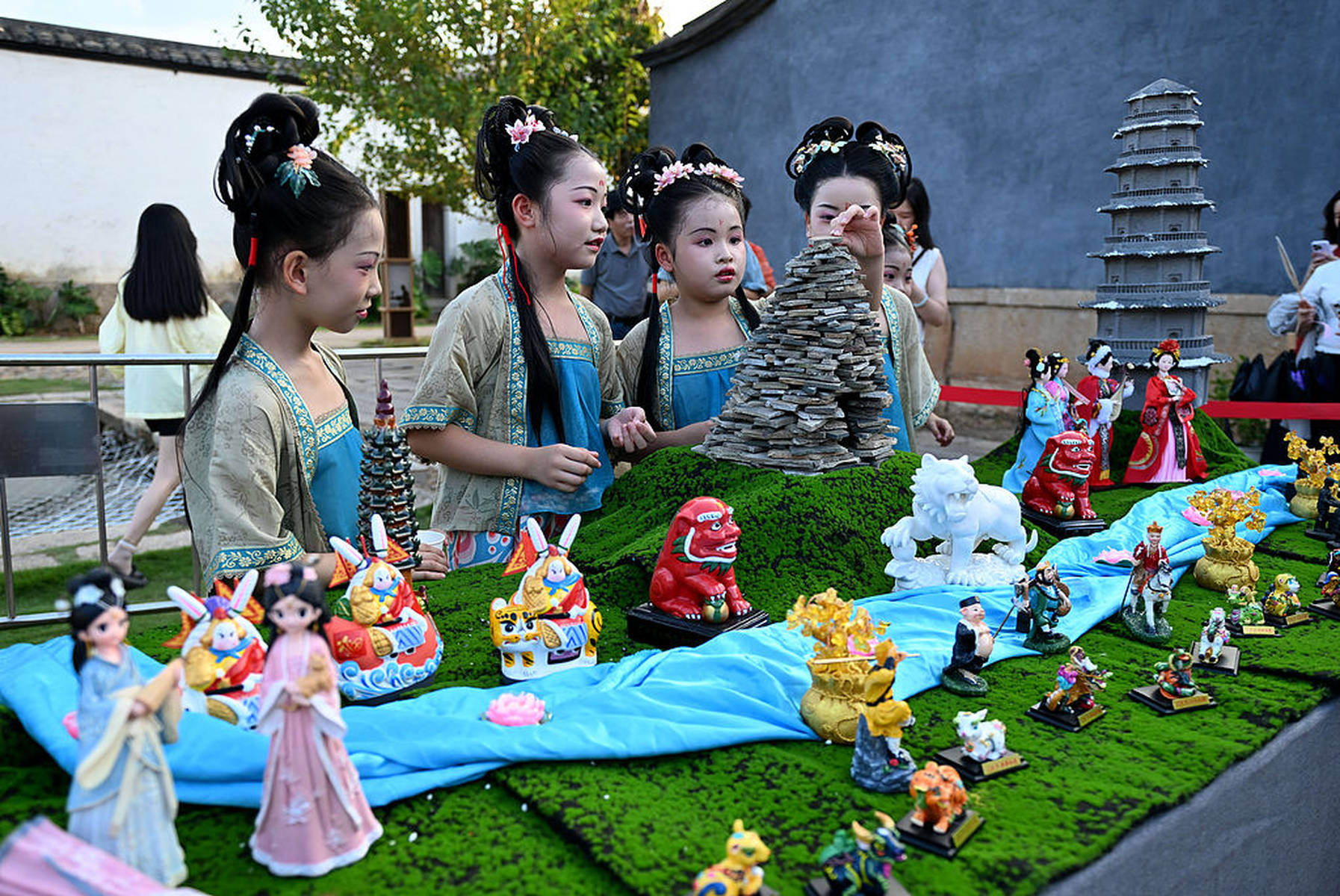 2025年10月5日,福建省福州市,图为小朋友体验福州中秋“摆塔”习俗。“摆塔”据传源于明嘉靖年间,戚继光将军率领他的戚家军来闽抗击倭寇,取得节节胜利。一次胜利正逢中秋,老百姓纷纷把家里的珍藏拿出来摆在厅堂上,或是在室外摆垒搭自然风景,营造欢庆胜利、欢度中秋佳节的气氛,后相沿成俗。