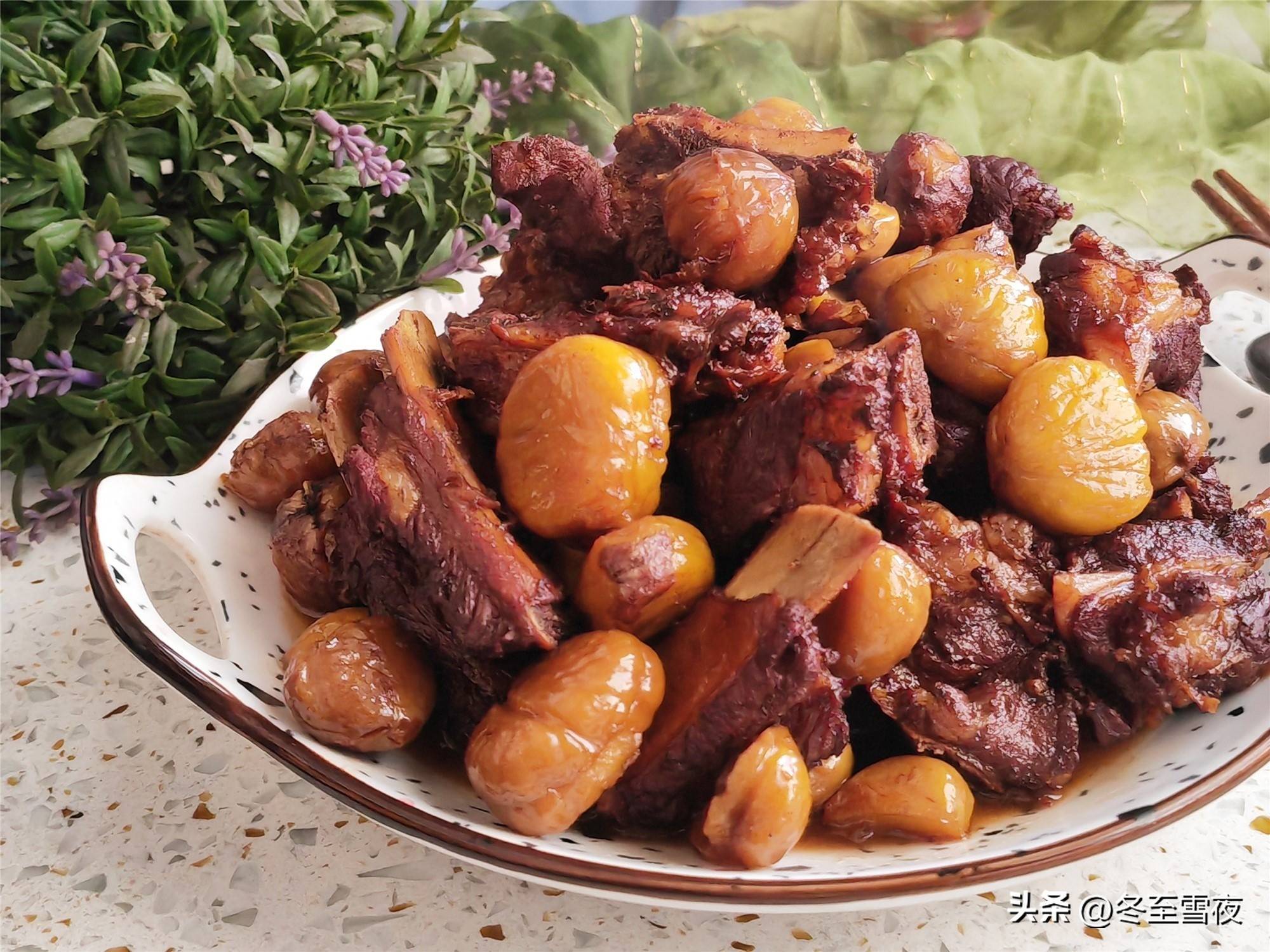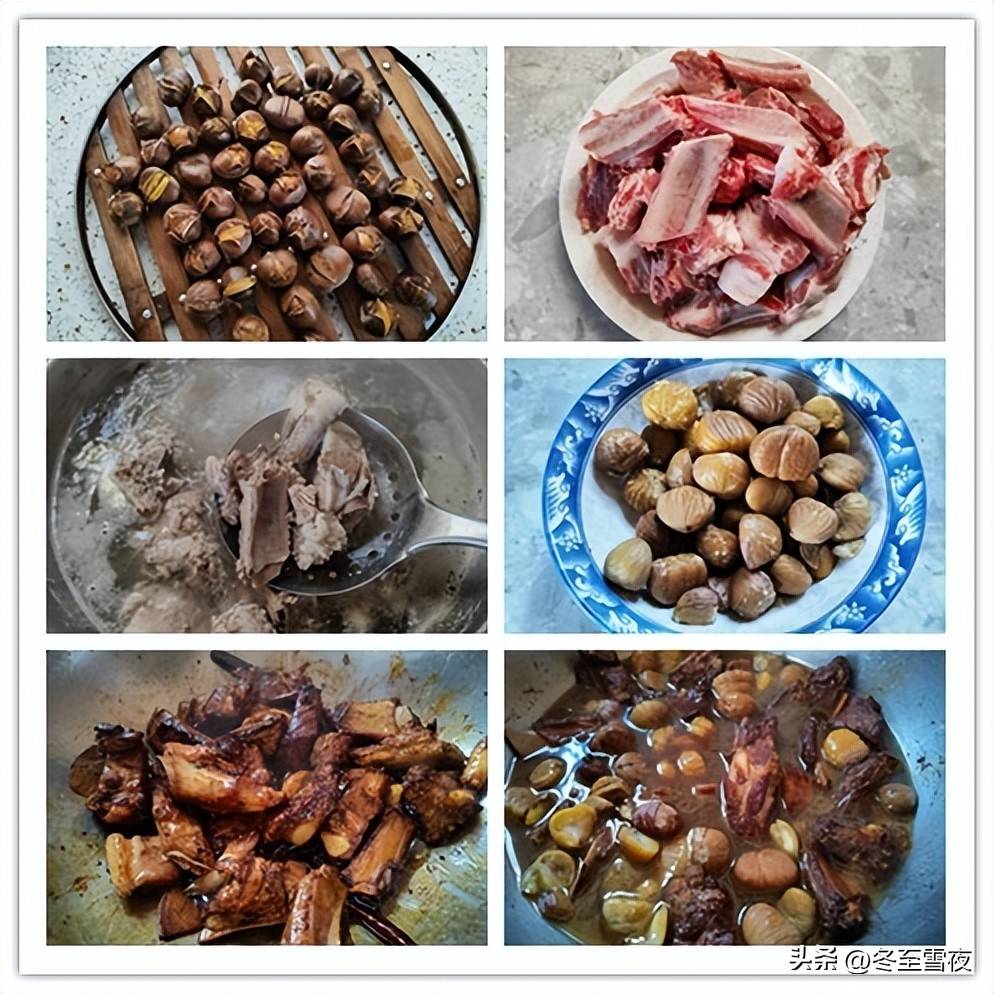 【板栗烧排骨】所需材料:排骨2斤、板栗1斤、油盐适量、葱1段、姜1块、大蒜2瓣、花椒10几粒,八角2个、香叶3-4片、干辣椒2-3个、生抽2汤匙、红烧酱油半汤匙、冰糖10几粒、料酒1汤匙、白胡椒粉1茶匙、