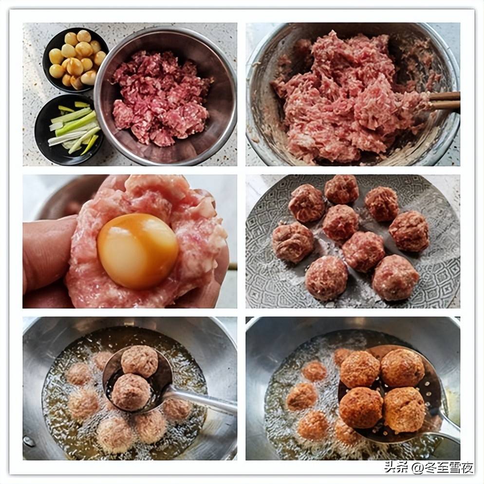 【龙眼丸子】所需材料:猪梅肉1斤、五香鹌鹑蛋20个左右、鸡蛋1个、淀粉3汤匙、面粉3汤匙、香油1汤匙、盐适量、大葱1段、姜3片、料酒1汤匙、胡椒粉1茶匙、花椒粉1茶匙、