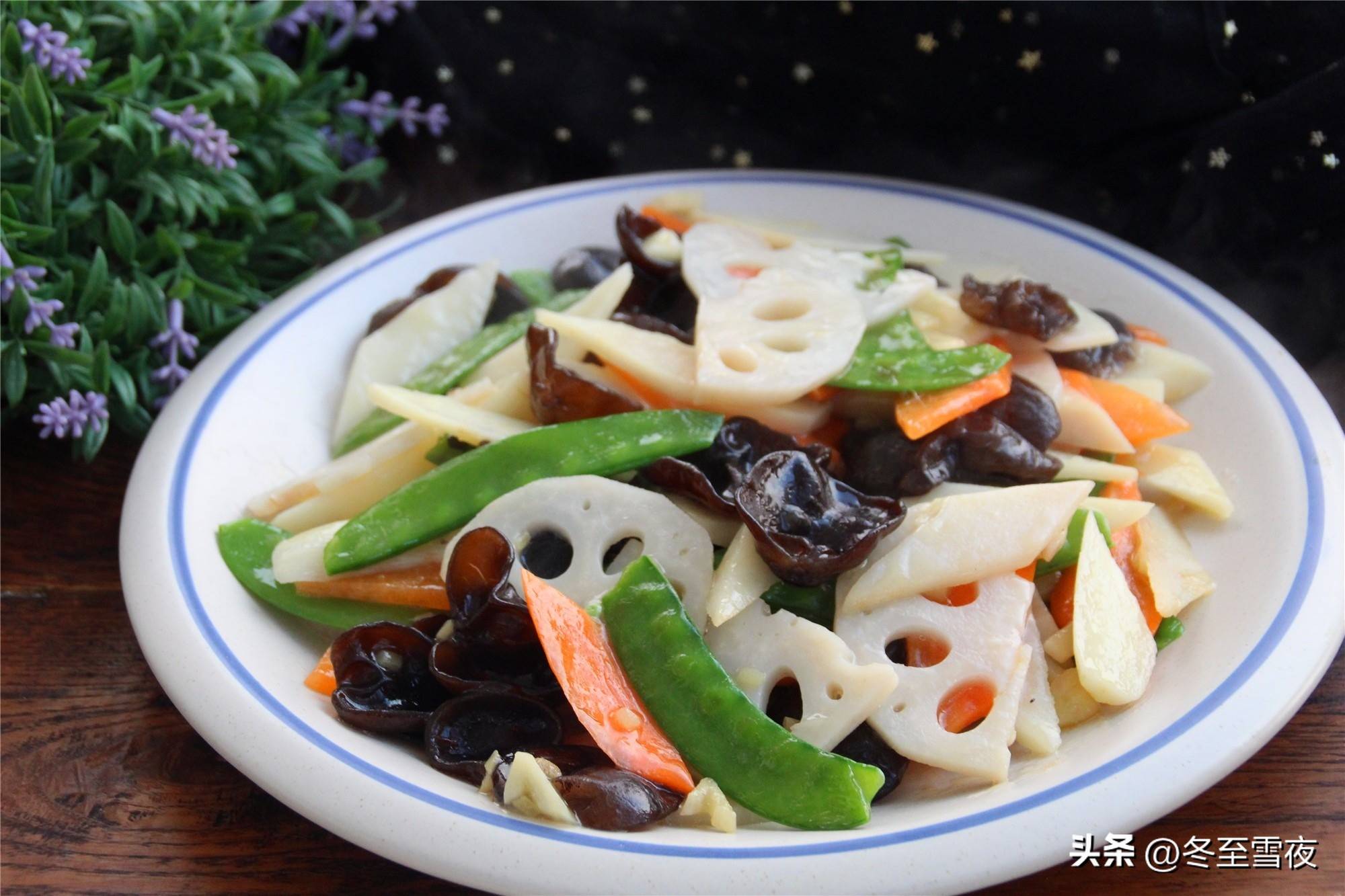 寓意:这道菜以莲藕、山药、荷兰豆、胡萝卜和木耳为主料,色彩丰富,口感清爽,象征四季平安、健康长寿。
