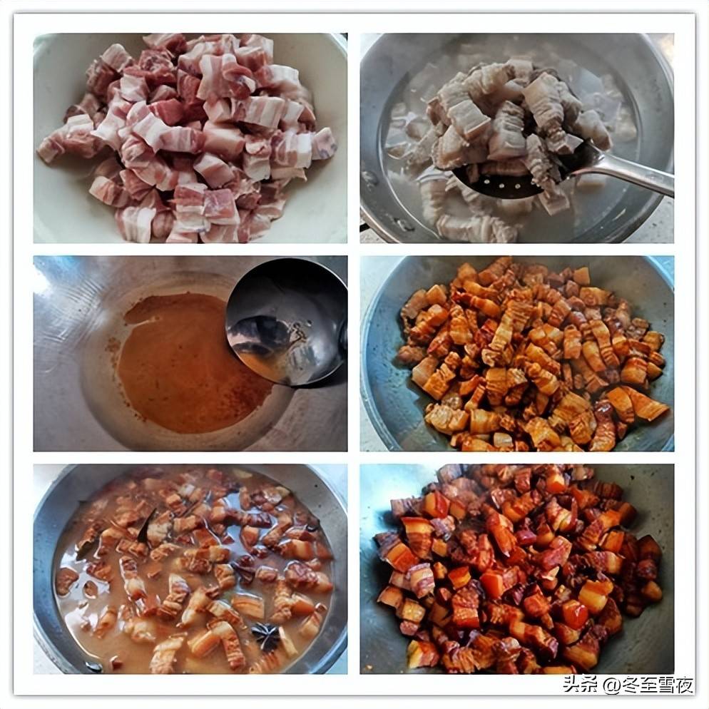 1. 处理五花肉:选用带皮的下五花肉,层层肥瘦相间,比例接近。将肉皮刮干净,切成3厘米见方的块。