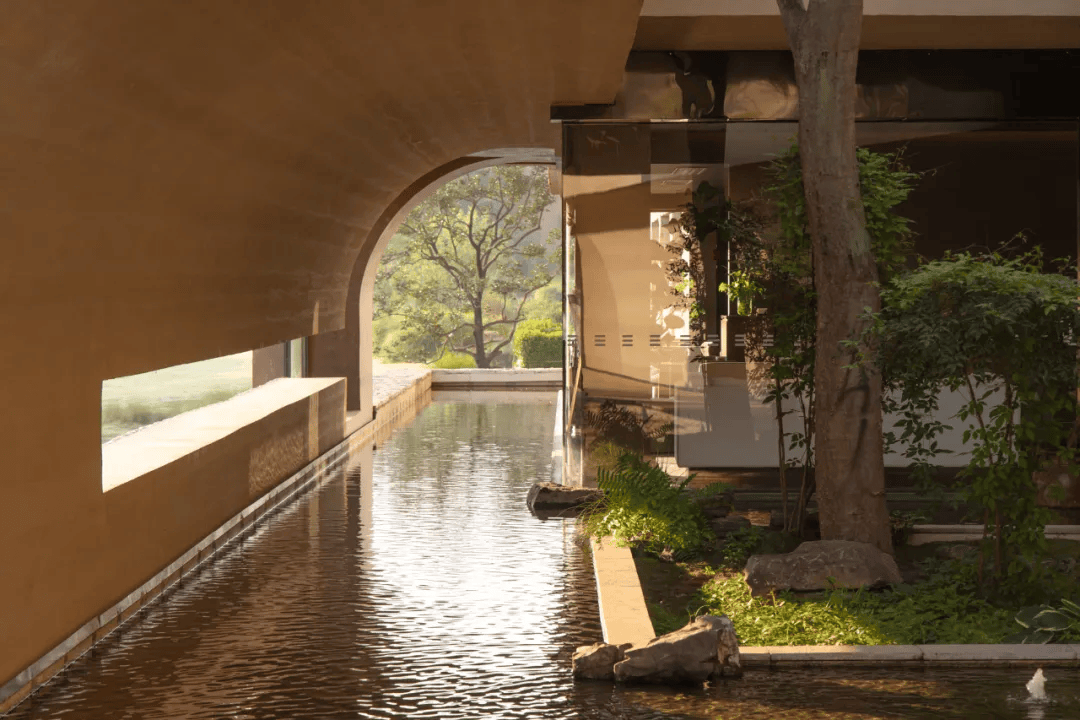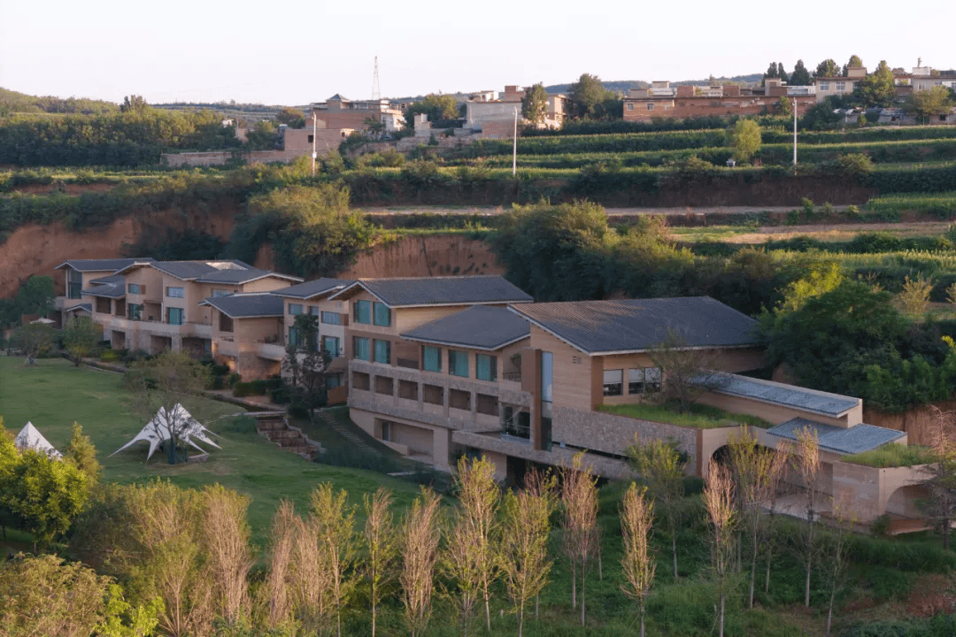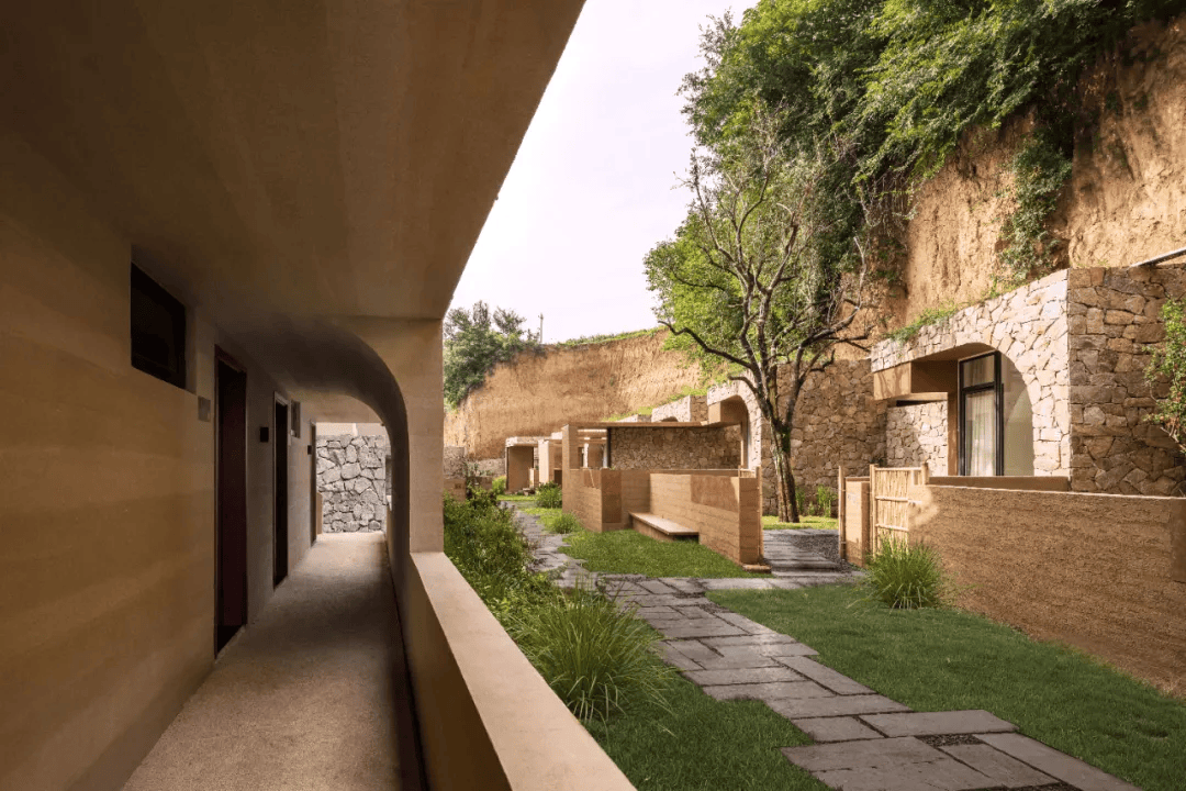 跃龙谷酒店坐落于洛阳龙门石窟附近的黄土沟谷中,由青墨建筑设计操刀,改造废弃窑洞群,融合建筑、室内与景观,重构乡村度假场景。设计保留原始田野与村落肌理,建筑沿狭长山谷轴线自由排布,以拱廊、斜屋顶、错动体块构建通透而松弛的街巷秩序。改造遵循“低介入、高保留”策略,修复窑洞结构,提升采光与通风,并引入地源热泵系统。材料上强调在地性与可持续,夯土、毛石、青瓦等与自然生态融合,营造出一种现代侘寂的隐逸氛围,激活在地文化记忆,重塑乡村活力。