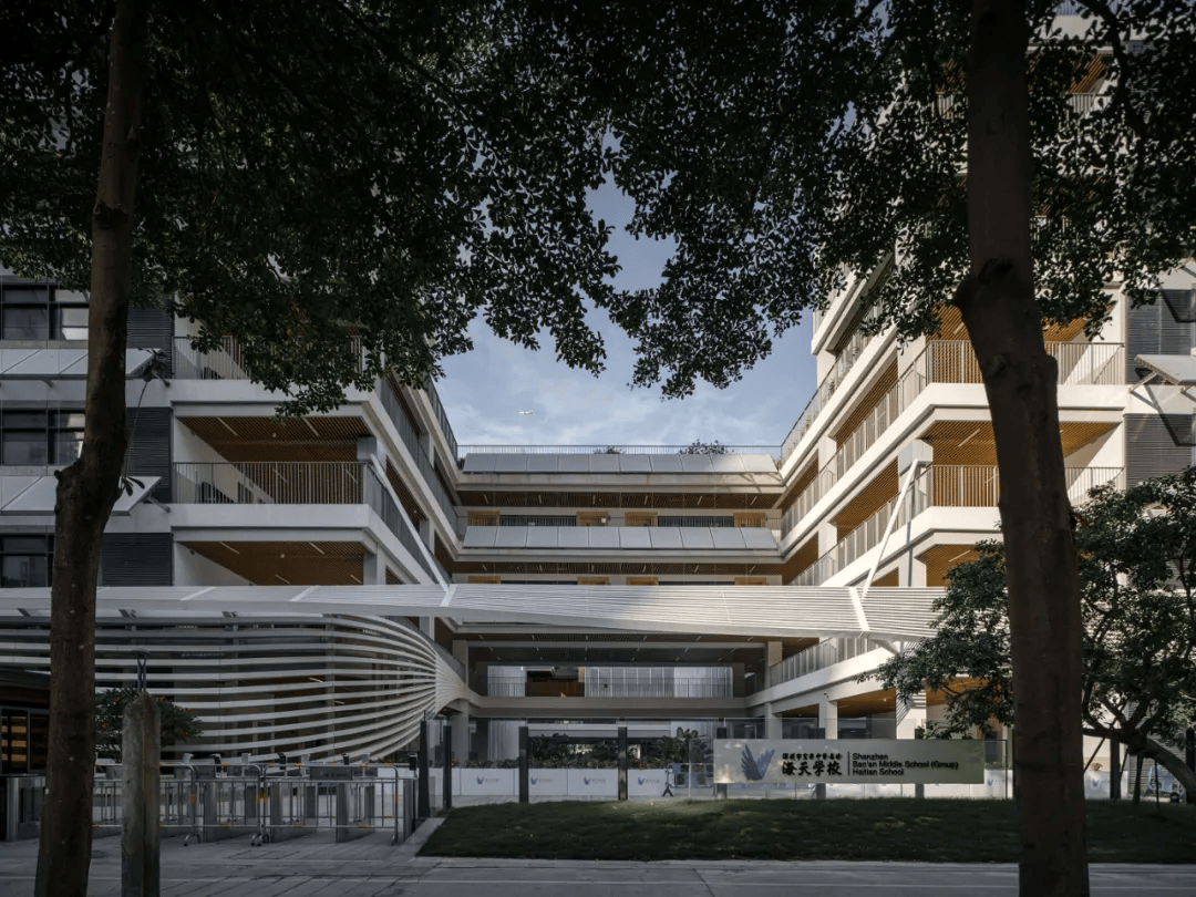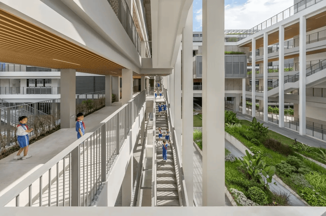 位于深圳核心区的海天学校,以“城市-校园”一体化的设计理念,突破传统内向型校园范式。面对地铁斜穿等场地限制,设计引入城市网格,将教学楼围合成院落,化解冲突的同时也回应城市肌理。东侧抬升的运动场下设球馆,实现土地复用,其转折面掀起“云之翼”形态,构建与社区共享的开放界面。教学空间则以组团式学习社区和兴趣庭院取代传统教室模式,串联起连续的立体回廊与公共路径,营造一个开放、立体、亲自然的校园街区。