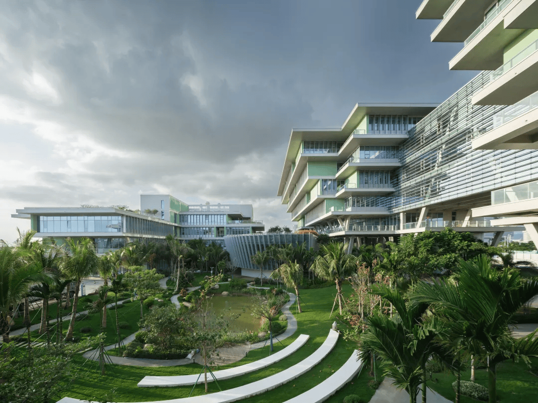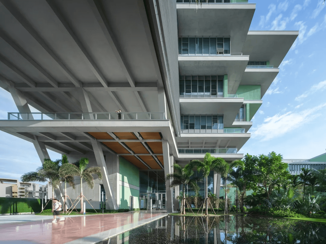 海南大学生物医学与健康研究中心位于三亚崖州湾科技城,由本土设计研究中心设计,是典型夏热冬暖地区绿色科研建筑的实践样本。项目以高标准实验室为核心,采用上大下小的形体策略,结合深挑檐、架空通廊与屋顶绿化,有效应对强光、暴雨、潮湿等热带海滨气候挑战。设计兼顾实验、教学、办公等多功能复合需求,强调结构耐久、能耗分区、智慧运维,通过通风、遮阳、雨水花园等多重策略实现舒适节能的科研环境,展现出科学与建筑美学的融合。