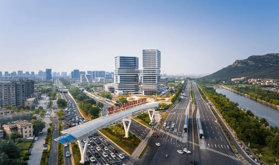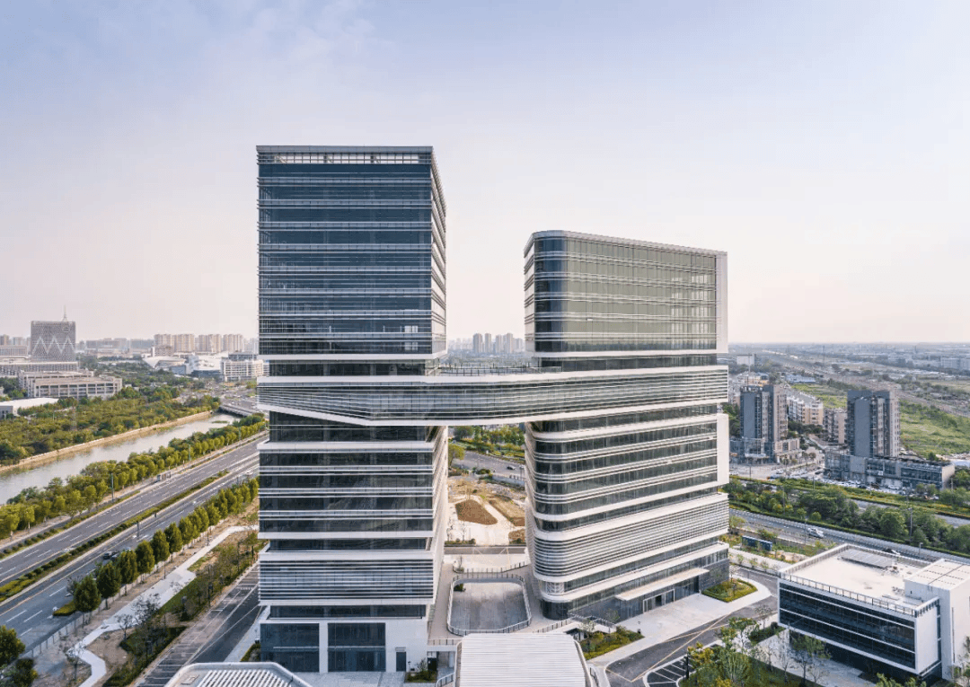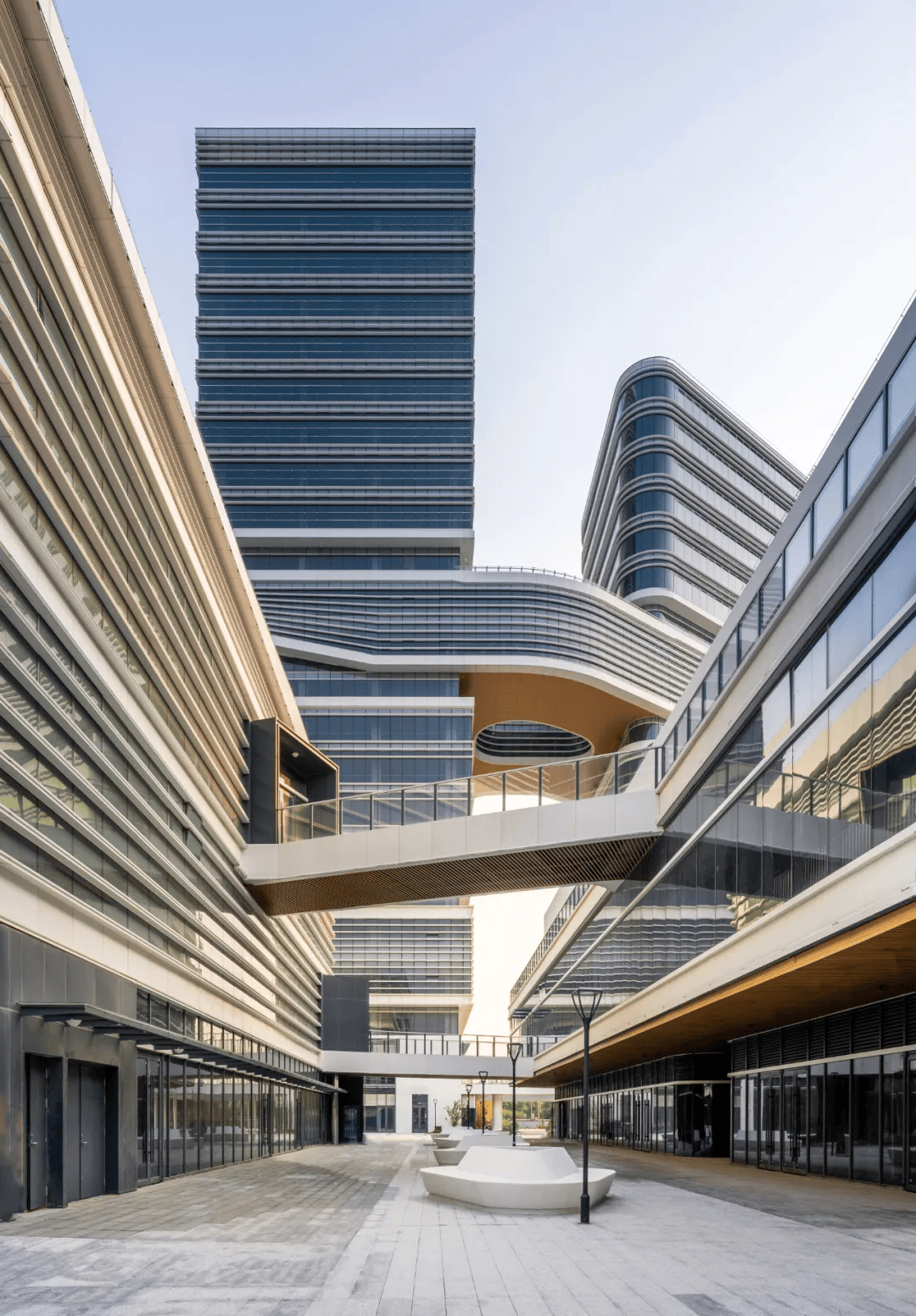 花果山总部经济园位于连云港开发区核心,以“未来之门、城市之窗”为设计理念,回应“三区联动”政策叠加优势,打造集总部办公、展示交流、商务休闲于一体的创新生态。项目由13栋高层与独栋建筑组成,双子塔通过云带连廊形成“山海连云”的意象,并融入LED格栅实现夜间光影叙事。园区动线清晰、功能互补,体现出强烈的场景感与可持续策略,成为连云港产城融合与城市形象展示的重要载体。