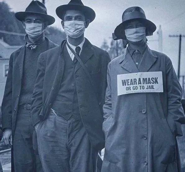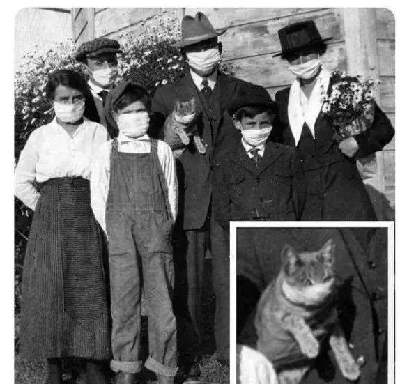 1918年,大流感时期人们纷纷戴起了口罩,就连拍全家福时候的猫咪也不能幸免。