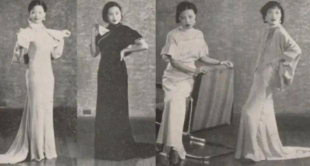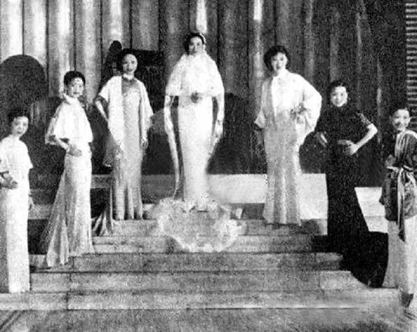 1929年,旗袍被正式确立为国家礼服之一。受欧美服装影响,传统宽松的旗袍逐渐转变为收腰修身的设计,更凸显女性曲线美。1930年的街头,两位身着改良旗袍的闺蜜漫步而过,她们的服饰融合了中西元素:既有中国传统刺绣的精美,又借鉴了西方剪裁的合体感。金鸿翔等裁缝大师对旗袍进行了大胆改革,将西式的开省、打裥技术与中式镶滚工艺结合,使旗袍成为“国服”的象征。(参考[13])1934年上海百乐门举行的时装表演大会上,徐琴芳、胡蝶等名媛明星身着新款旗袍登台,将这一东方时尚推向高潮,见证了民国时期女性意识觉醒与审美观念的转变。