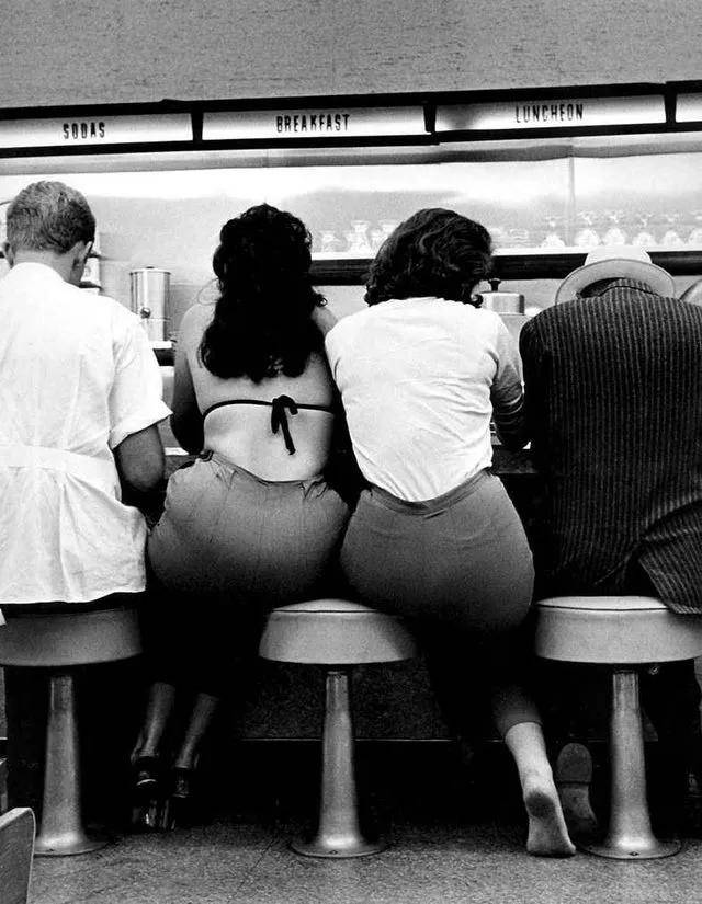 1963 年,好莱坞 Lee Drugs 的午餐柜台,两个女性因为只有一个座位而被迫挤在一起。