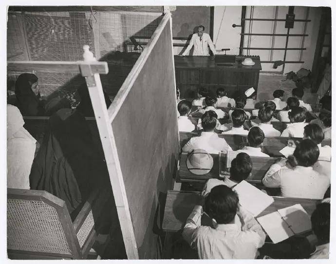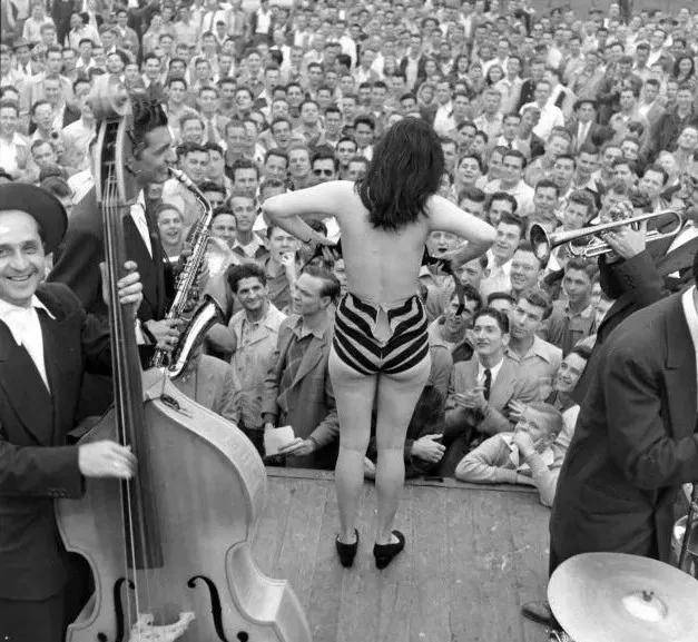 1948 年,滑稽舞者“Stormy”劳伦斯在室外为路易斯安那州立大学的学生表演了一场脱衣舞。