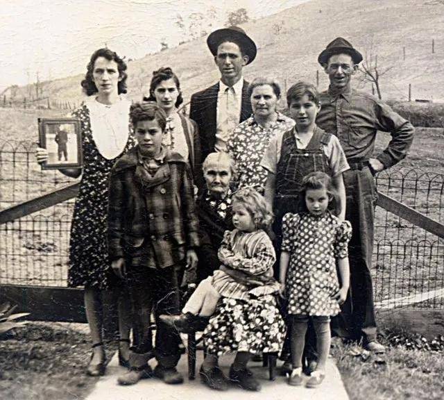 1944 年,奶奶拿着逝去爷爷的照片一起拍全家福,虽然爷爷因战争英年早逝,但奶奶从未忘记过他,并在爷爷去世后的每一年,都会拿着相框与家人合照。