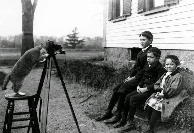1945年,孩子们邀请一只橘猫担任“摄影师”,试图让它通过取景框拍摄全家福。这只橘猫努力配合的姿态既滑稽又温馨。而在1954年,两只名叫Blackie和Brownie的猫咪溜进奶牛场偷喝牛奶的照片,则展现了动物天生的好奇心与贪吃本性。这些充满生活情趣的画面为严肃的历史增添了轻松一笔。