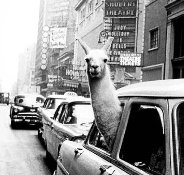 1957年,时代广场的一只羊驼用自己的耳朵朝后面的司机比了一个V。