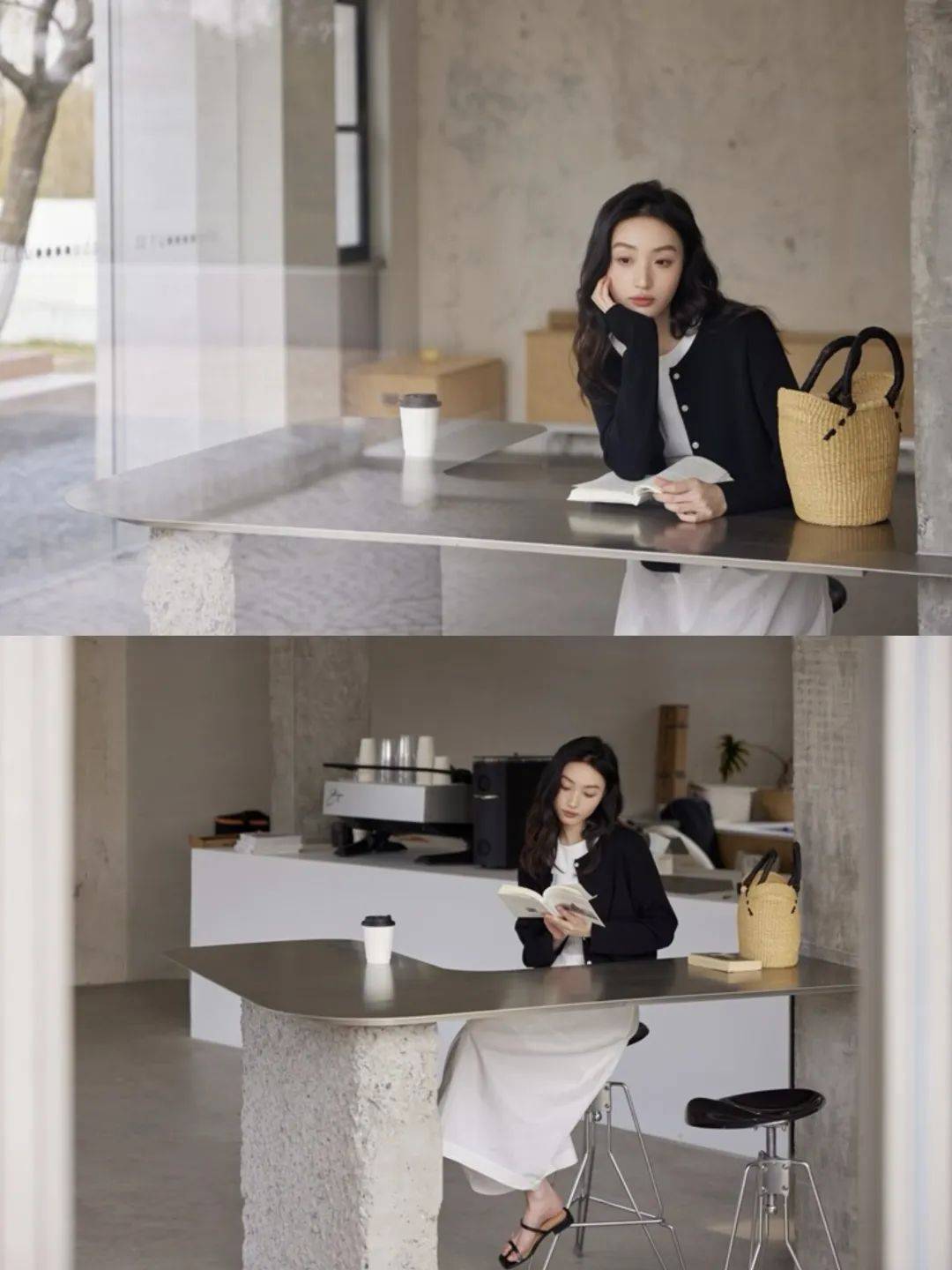 身穿白色的衬衫,黑色的西装外套,上半身职场风格瞬间拉满。