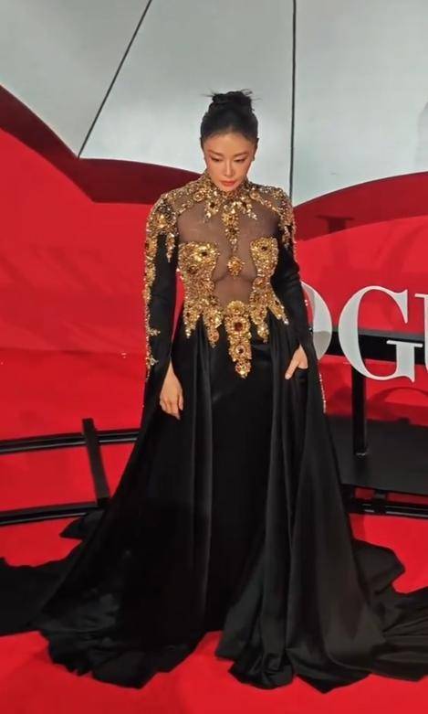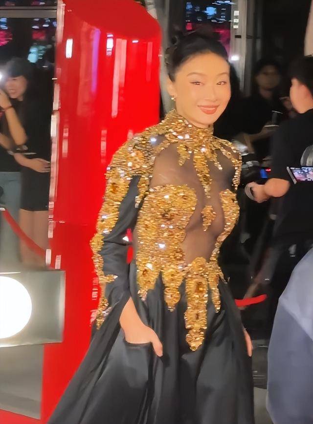 - 服装设计:上半身近乎真空出镜,隐私部位轮廓暴露;黑色蕾丝礼服搭配大量金色装饰,视觉上“满且俗”,被网友调侃“可真敢穿”。